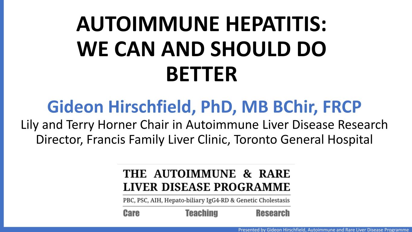 Presented by Gideon Hirschfield, Autoimmune and Rare Liver Disease Programme AUTOIMMUNE HEPATITIS: WE CAN AND SHOULD DO BETTER Gideon Hirschfield, PhD, MB BChir, FRCP Lily and Terry Horner Chair in Autoimmune Liver Disease Research Director, Francis Family Liver Clinic, Toronto General Hospital