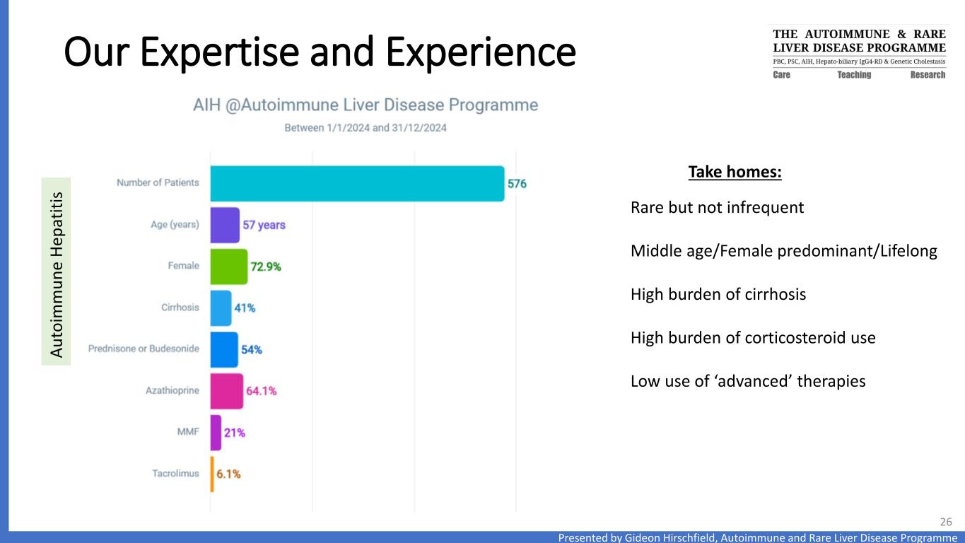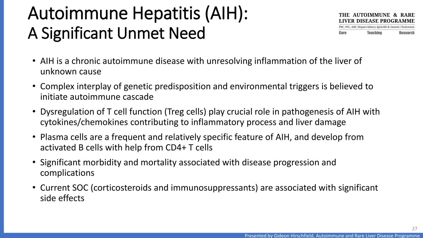 Presented by Gideon Hirschfield, Autoimmune and Rare Liver Disease Programme 26 Our Expertise and Experience Rare but not infrequent Middle age/Female predominant/Lifelong High burden of cirrhosis High burden of corticosteroid use Low use of ‘advanced’ therapies Au to im m un e He pa tit is Take homes: