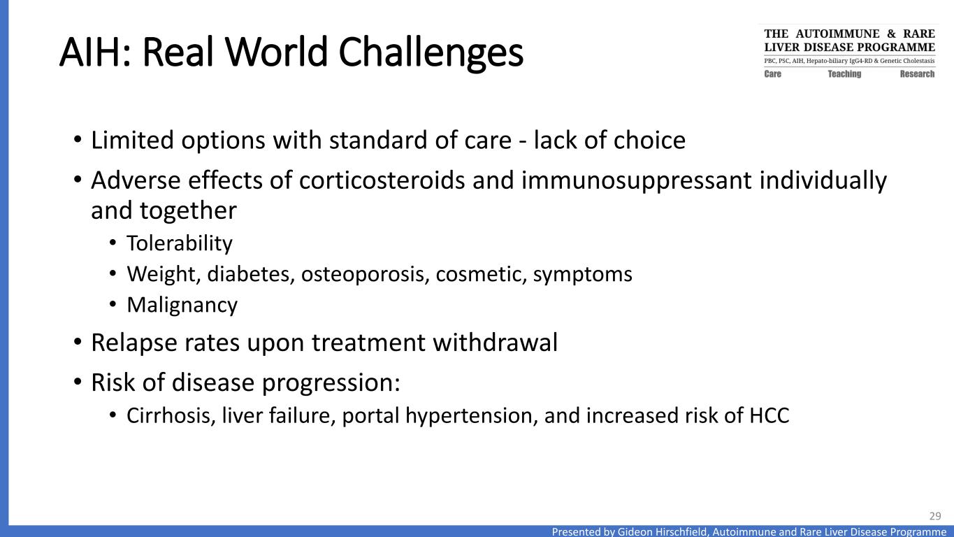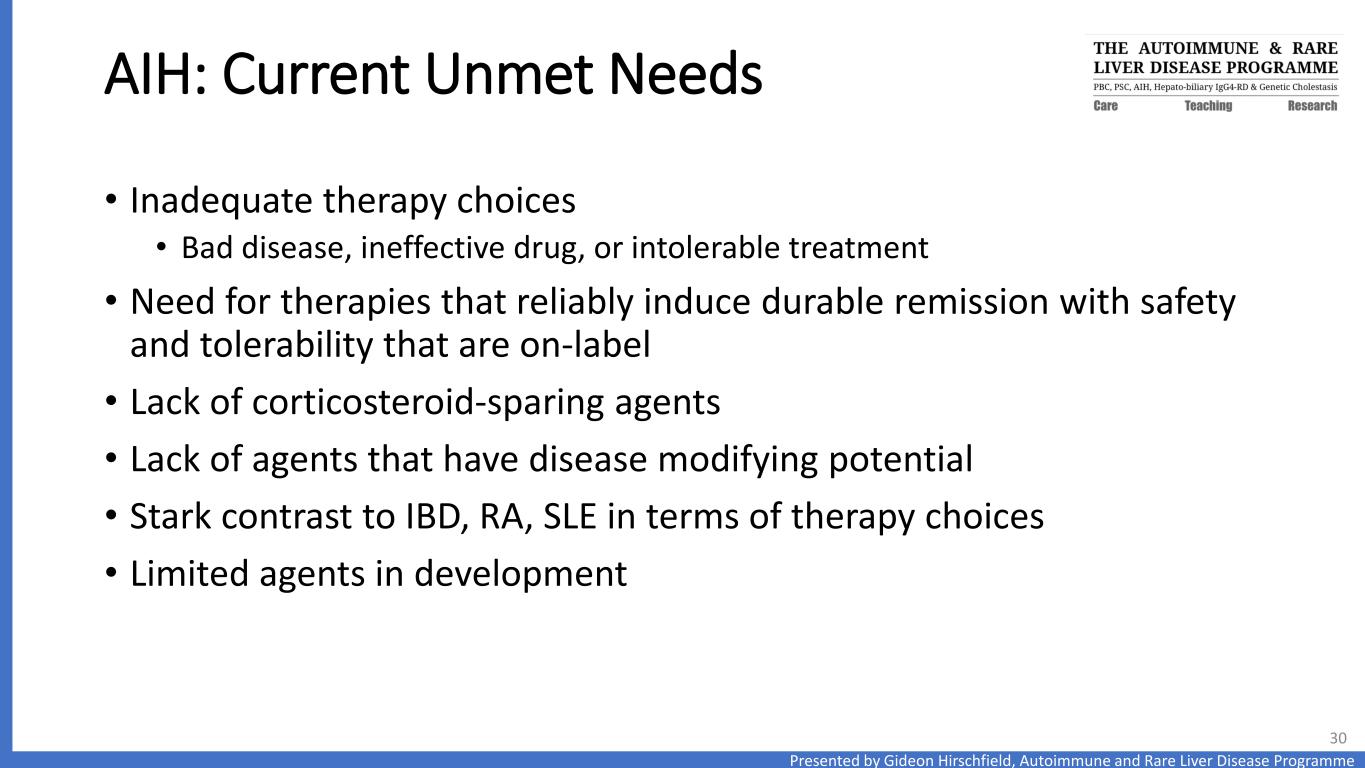 Presented by Gideon Hirschfield, Autoimmune and Rare Liver Disease Programme AIH: Real World Challenges • Limited options with standard of care - lack of choice • Adverse effects of corticosteroids and immunosuppressant individually and together • Tolerability • Weight, diabetes, osteoporosis, cosmetic, symptoms • Malignancy • Relapse rates upon treatment withdrawal • Risk of disease progression: • Cirrhosis, liver failure, portal hypertension, and increased risk of HCC 29