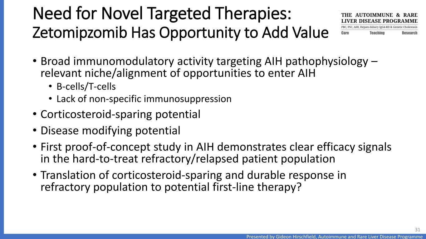 Presented by Gideon Hirschfield, Autoimmune and Rare Liver Disease Programme AIH: Current Unmet Needs • Inadequate therapy choices • Bad disease, ineffective drug, or intolerable treatment • Need for therapies that reliably induce durable remission with safety and tolerability that are on-label • Lack of corticosteroid-sparing agents • Lack of agents that have disease modifying potential • Stark contrast to IBD, RA, SLE in terms of therapy choices • Limited agents in development 30