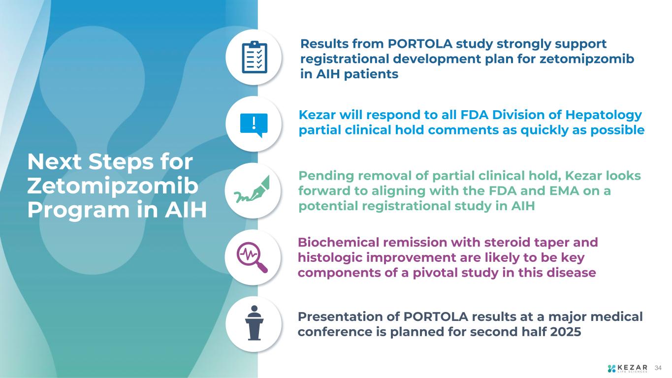 Next Steps for Zetomipzomib Program in AIH Pending removal of partial clinical hold, Kezar looks forward to aligning with the FDA and EMA on a potential registrational study in AIH Kezar will respond to all FDA Division of Hepatology partial clinical hold comments as quickly as possible Biochemical remission with steroid taper and histologic improvement are likely to be key components of a pivotal study in this disease 34 Presentation of PORTOLA results at a major medical conference is planned for second half 2025 Results from PORTOLA study strongly support registrational development plan for zetomipzomib in AIH patients