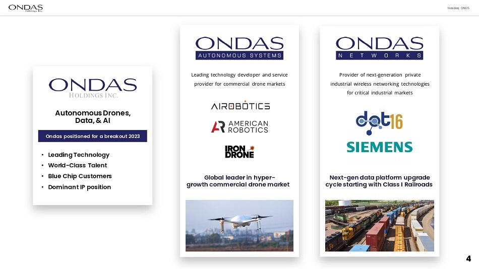 Nasdaq: ONDS As required by the rules of the Securities and Exchange Commission (“SEC”), we provide a reconciliation of Adjusted EBITDA, the non - GAAP financial measure, contained in this presentation to the most directly comparable measure under GAAP, which reconciliation is set forth in the table included in the Appendix of this presentation . We believe that Adjusted EBITDA facilitates analysis of our ongoing business operations because it excludes items that may not be reflective of, or are unrelated to, the Company’s core operating performance, and may assist investors with comparisons to prior periods and assessing trends in our underlying businesses . Other companies may calculate Adjusted EBITDA differently, and therefore our measures may not be comparable to similarly titled measures used by other companies . Adjusted EBITDA should only be used as supplemental measures of our operating performance . We believe that Adjusted EBITDA improves comparability from period to period by removing the impact of our capital structure (interest and financing expenses), asset base (depreciation and amortization), tax impacts and other adjustments as set out in the table included in the Appendix of this presentation, which management has determined are not reflective of core operating activities and thereby assist investors with assessing trends in our underlying businesses . Management uses Adjusted EBITDA in making financial, operating and planning decisions and evaluating the Company's ongoing performance . With respect to our financial target for 2023 for Adjusted EBITDA a reconciliation of this non - GAAP measure to the corresponding GAAP measure is not available without unreasonable effort due to the variability and complexity of the reconciling items described above that we exclude from this non - GAAP target measure . The variability of these items may have a significant impact on our future GAAP financial results and, as a result, we are unable to prepare the forward - looking statement of income prepared in accordance with GAAP, that would be required to produce such a reconciliation . 3 Non - GAAP Financial Measure