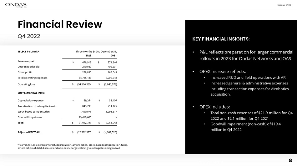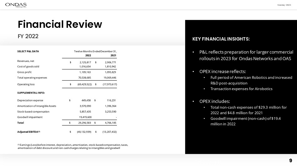 Nasdaq: ONDS Q4 2022 Financial Review KEY FINANCIAL INSIGHTS: • P&L reflects preparation for larger commercial rollouts in 2023 for Ondas Networks and OAS • OPEX increase reflects : • Increased R&D and field operations with AR • Increased general & administrative expenses including transaction expenses for Airobotics acquisition . • OPEX includes: • Total non - cash expenses of $21.9 million for Q4 2022 and $2.1 million for Q4 2021 • Goodwill impairment (non - cash) of $19.4 million in Q4 2022 8 Placeholder SELECT P&L DATA Three Months Ended December 31, 2022 2021 Revenues, net $ 478,912 $ 571,246 Cost of goods sold 210,082 405,201 Gross profit 268,830 166,045 Total operating expenses 34,785,185 7,206,618 Operating loss $ (34,516,355) $ (7,040,573) SUPPLEMENTAL INFO: Depreciation expense $ 169,264 $ 38,406 Amortization of Intangible Assets 843,793 714,125 Stock - based compensation 1,490,071 1,298,517 Goodwill impairment 19,419,600 - Total $ 21,922,728 $ 2,051,048 Adjusted EBITDA (1) $ (12,592,997) $ ( 4,989,523) (1) Earnings (Loss) before interest, depreciation, amortization, stock - based compensation, taxes, amortization of debt discount and non - cash charges relating to intangibles and goodwill