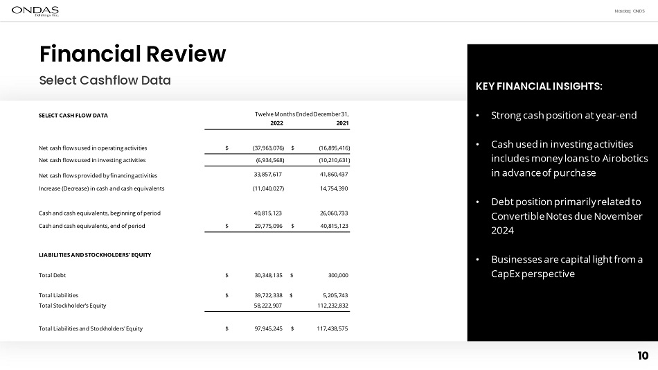 Nasdaq: ONDS FY 2022 Financial Review KEY FINANCIAL INSIGHTS: • P&L reflects preparation for larger commercial rollouts in 2023 for Ondas Networks and OAS • OPEX increase reflects: • Full period of American Robotics and increased R&D post - acquisition • Transaction expenses for Airobotics • OPEX includes: • Total non - cash expenses of $29.3 million for 2022 and $4.8 million for 2021 • Goodwill impairment (non - cash) of $19.4 million in 2022 9 Placeholder SELECT P&L DATA Twelve Months Ended December 31, 2022 2021 Revenues, net $ 2,125,817 $ 2,906,771 Cost of goods sold 1,016,654 1,810,942 Gross profit 1,109,163 1,095,829 Total operating expenses 70,538,685 19,069,446 Operating loss $ (69,429,522) $ (17,973,617) SUPPLEMENTAL INFO: Depreciation expense $ 449,458 $ 116,231 Amortization of Intangible Assets 3,570,090 1,396,364 Stock - based compensation 5,857,435 3,253,590 Goodwill impairment 19,419,600 - Total $ 29,296,583 $ 4,766,185 Adjusted EBITDA (1) $ (40,132,939) $ (13,207,432) (1) Earnings (Loss) before interest, depreciation, amortization, stock - based compensation, taxes, amortization of debt discount and non - cash charges relating to intangibles and goodwill
