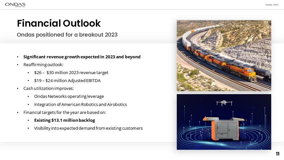 Nasdaq: ONDS Select Cashflow Data 10 Financial Review KEY FINANCIAL INSIGHTS: • Strong cash position at year - end • Cash used in investing activities includes money loans to Airobotics in advance of purchase • Debt position primarily related to Convertible Notes due November 2024 • Businesses are capital light from a CapEx perspective SELECT CASH FLOW DATA Twelve Months Ended December 31, 2022 2021 Net cash flows used in operating activities $ (37,963,076) $ (16,895,416) Net cash flows used in investing activities (6,934,568) (10,210,631) Net cash flows provided by financingactivities 33,857,617 41,860,437 Increase (Decrease) in cash and cash equivalents (11,040,027) 14,754,390 Cash and cash equivalents, beginning of period 40,815,123 26,060,733 Cash and cash equivalents, end of period $ 29,775,096 $ 40,815,123 LIABILITIES AND STOCKHOLDERS' EQUITY Total Debt $ 30,348,135 $ 300,000 Total Liabilities $ 39,722,338 $ 5,205,743 Total Stockholder's Equity 58,222,907 112,232,832 Total Liabilities and Stockholders' Equity $ 97,945,245 $ 117,438,575
