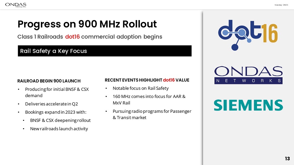 Nasdaq: ONDS Bandwidth Enables Safety Existing and new applications creates explosion of edge activity RAILROAD INFRASTRUCTURE • Private, Owned& Operated • Secure, Reliable, QoS • Flexible; interoperable • Backwards compatible • Nationwide coverage • Lower cost PRIVATE NETWORKS Onboard Telemetry 450MHZ ATCS 900 MHz Voice 160 MHz PTC 220 MHz FCC Mandate 15
