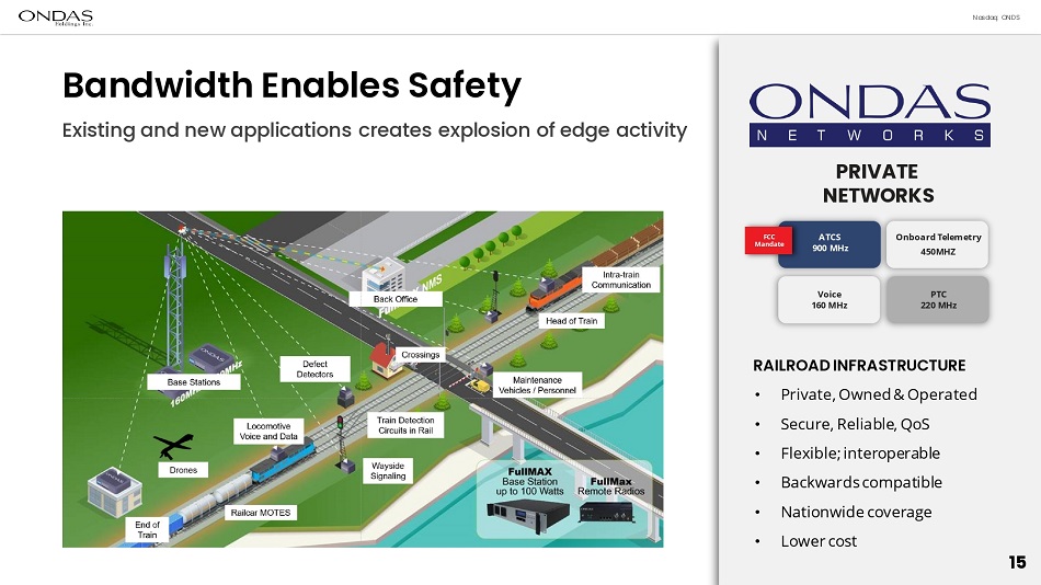 Nasdaq: ONDS Applications are data intensive; requiring more robust wireless networks Network is Backbone for Rail Safety IEEE 802.16 evolution moves towards ratification FCC Report & Order – 900 MHz SELECT WORKING GROUP PARTICIPANTS dot16 RAIL LAB • MxV Rail working on application integration • Network Controller expands value • Extensive programs in motion • Rail standards to be published … would allow AAR to upgrade its network with additional features … such as advanced defect detection (e . g . , thermal imaging), increased support for rail integrity monitoring, increased oversight of maintenance activities, and continuous monitoring of highway grade crossing equipment . Moreover, a paired wideband channel allows implementation of redundant paths for PTC base station backhaul, especially in remote areas and difficult terrain . – FCC May 2020 14