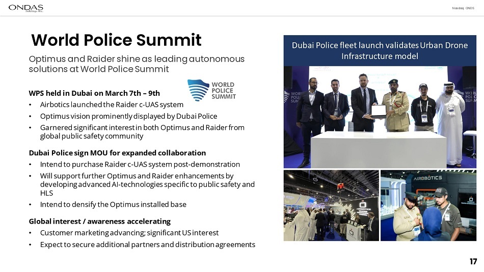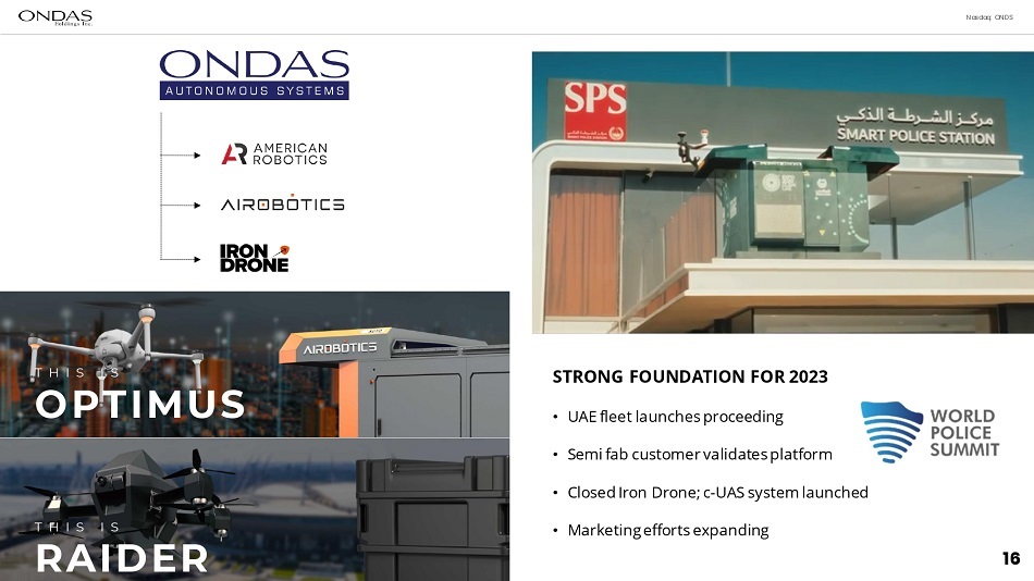 Nasdaq: ONDS STRONG FOUNDATION FOR 2023 • UAE fleet launches proceeding • Semi fab customer validates platform • Closed Iron Drone; c - UAS system launched • Marketing efforts expanding T H I S I S RAIDER T H I S I S OPTIMUS 16