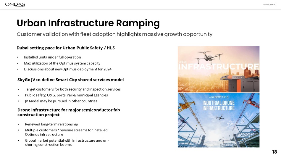 Nasdaq: ONDS Optimus and Raider shine as leading autonomous solutions at World Police Summit World Police Summit WPS held in Dubai on March 7th – 9th • Airbotics launched the Raider c - UAS system • Optimus vision prominently displayed by Dubai Police • Garnered significant interest in both Optimus and Raider from global public safety community Dubai Police sign MOU for expanded collaboration • Intend to purchase Raider c - UAS system post - demonstration • Will support further Optimus and Raider enhancements by developing advanced AI - technologies specific to public safety and HLS • Intend to densify the Optimus installed base Global interest / awareness accelerating • Customer marketing advancing; significant US interest • Expect to secure additional partners and distribution agreements Dubai Police fleet launch validates Urban Drone Infrastructure model 17