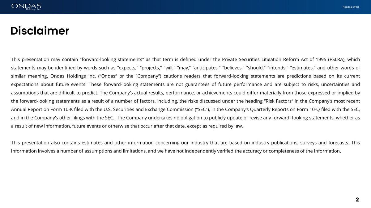2 Nasdaq: ONDS This presentation may contain "forward - looking statements" as that term is defined under the Private Securities Litigation Reform Act of 1995 (PSLRA), which statements may be identified by words such as "expects," "projects," "will," "may," "anticipates," "believes," "should," "intends," "estimates," and other words of similar meaning . Ondas Holdings Inc . (“Ondas” or the “Company”) cautions readers that forward - looking statements are predictions based on its current expectations about future events . These forward - looking statements are not guarantees of future performance and are subject to risks, uncertainties and assumptions that are difficult to predict . The Company’s actual results, performance, or achievements could differ materially from those expressed or implied by the forward - looking statements as a result of a number of factors, including, the risks discussed under the heading “Risk Factors” in the Company’s most recent Annual Report on Form 10 - K filed with the U . S . Securities and Exchange Commission (“SEC”), in the Company’s Quarterly Reports on Form 10 - Q filed with the SEC, and in the Company’s other filings with the SEC . The Company undertakes no obligation to publicly update or revise any forward - looking statements, whether as a result of new information, future events or otherwise that occur after that date, except as required by law . This presentation also contains estimates and other information concerning our industry that are based on industry publications, surveys and forecasts . This information involves a number of assumptions and limitations, and we have not independently verified the accuracy or completeness of the information . Disclaimer