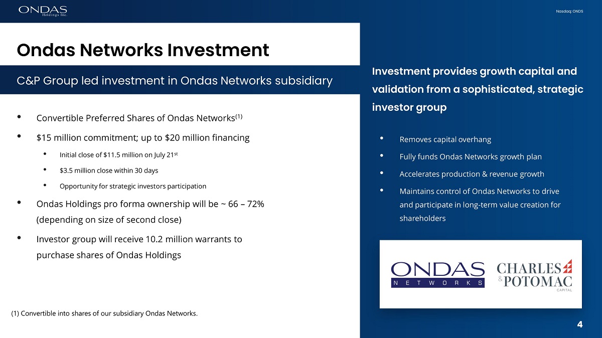 3 Nasdaq: ONDS Listed Nasdaq: ONDS Employees 108 Invested Capital > $275 Million Offices Waltham, MA Sunnyvale, CA Petah Tikva, Israel Proprietary, Platform Technologies Integrated, Data Ecosystem Blue Chip Customers Large, Critical End Markets Mission - critical Data Solutions Provider of next - generation private industrial wireless networking technologies for critical industrial markets Next - gen data platform upgrade cycle starting with Class I Railroads Leading data and information services solution for commercial drone markets Global leader in hyper - growth commercial drone market 2023 can be a major inflection point for Ondas