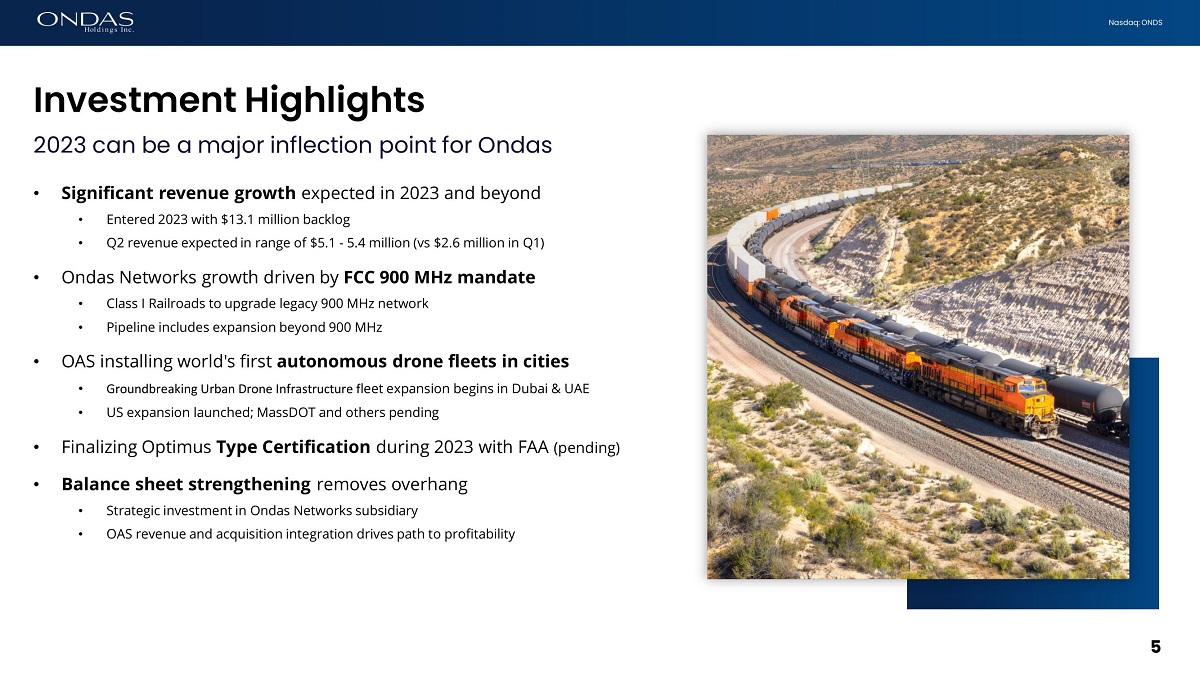 4 Nasdaq: ONDS Ondas Networks Investment C&P Group led investment in Ondas Networks subsidiary • Removes capital overhang • Fully funds Ondas Networks growth plan • Accelerates production & revenue growth • Maintains control of Ondas Networks to drive and participate in long - term value creation for shareholders • Convertible Preferred Shares of Ondas Networks (1) • $15 million commitment; up to $20 million financing • Initial close of $11.5 million on July 21 st • $3.5 million close within 30 days • Opportunity for strategic investors participation • Ondas Holdings pro forma ownership will be ~ 66 – 72% (depending on size of second close) • Investor group will receive 10.2 million warrants to purchase shares of Ondas Holdings Investment provides growth capital and validation from a sophisticated, strategic investor group 4 (1) Convertible into shares of our subsidiary Ondas Networks.