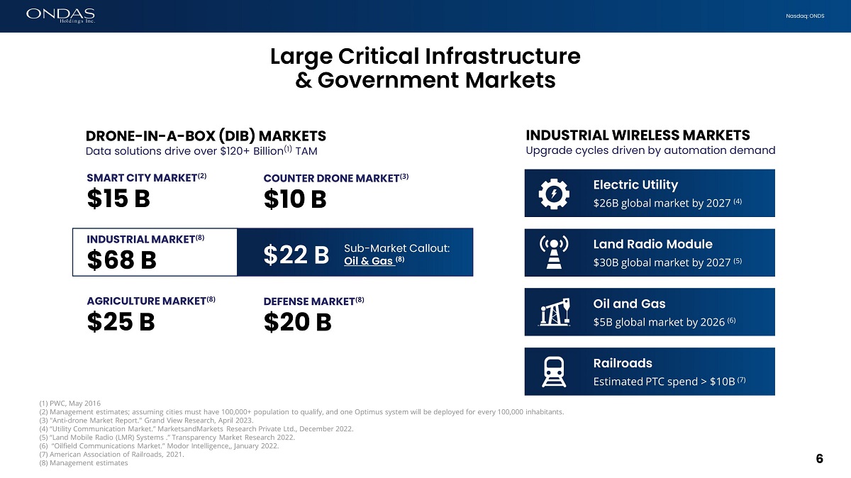 5 Nasdaq: ONDS Investment Highlights 2023 can be a major inflection point for Ondas • Significant revenue growth expected in 2023 and beyond • Entered 2023 with $13.1 million backlog • Q2 revenue expected in range of $5.1 - 5.4 million (vs $2.6 million in Q1) • Ondas Networks growth driven by FCC 900 MHz mandate • Class I Railroads to upgrade legacy 900 MHz network • Pipeline includes expansion beyond 900 MHz • OAS installing world's first autonomous drone fleets in cities • Groundbreaking Urban Drone Infrastructure f leet expansion begins in Dubai & UAE • US expansion launched; MassDOT and others pending • Finalizing Optimus Type Certification during 2023 with FAA (pending) • Balance sheet strengthening removes overhang • Strategic investment in Ondas Networks subsidiary • OAS revenue and acquisition integration drives path to profitability