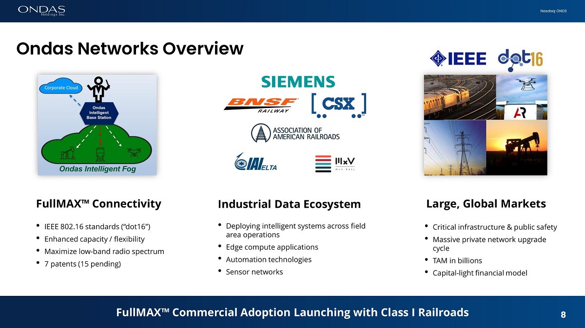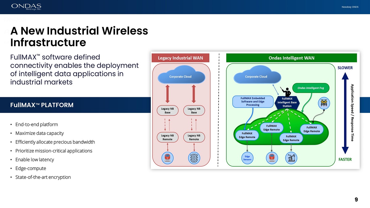 8 Nasdaq: ONDS FullMAX Œ Commercial Adoption Launching with Class I Railroads Ondas Networks Overview FullMAX Œ Connectivity • IEEE 802.16 standards (“dot16”) • Enhanced capacity / flexibility • Maximize low - band radio spectrum • 7 patents (15 pending) Industrial Data Ecosystem • Deploying intelligent systems across field area operations • Edge compute applications • Automation technologies • Sensor networks Large, Global Markets • Critical infrastructure & public safety • Massive private network upgrade cycle • TAM in billions • Capital - light financial model 8