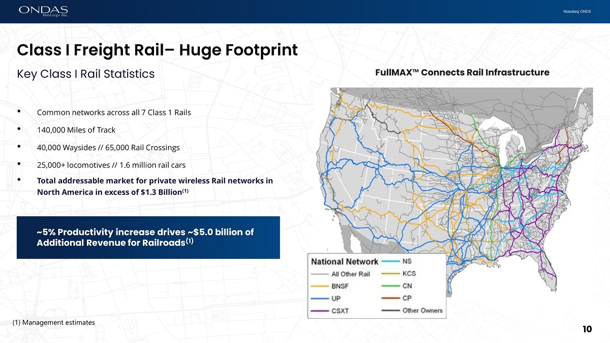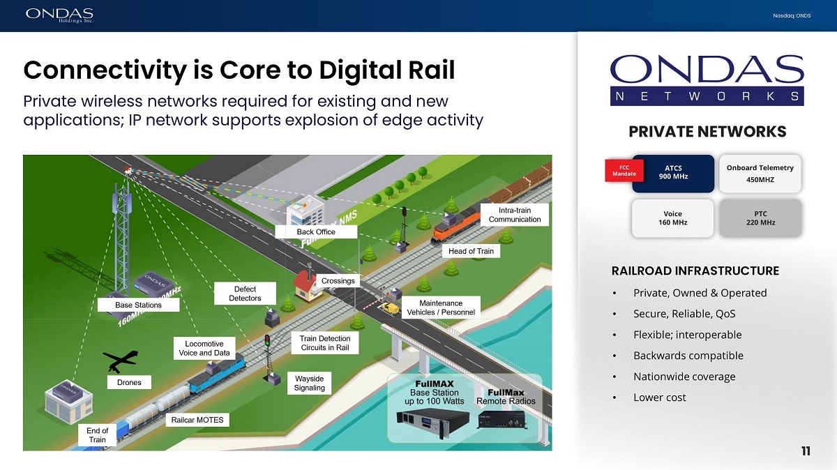 10 Nasdaq: ONDS Class I Freight Rail – Huge Footprint Key Class I Rail Statistics • Common networks across all 7 Class 1 Rails • 140,000 Miles of Track • 40,000 Waysides // 65,000 Rail Crossings • 25,000+ locomotives // 1.6 million rail cars • Total addressable market for private wireless Rail networks in North America in excess of $1.3 Billion (1) ~5% Productivity increase drives ~$5.0 billion of Additional Revenue for Railroads (1) FullMAX Œ Connects Rail Infrastructure 10 (1) Management estimates