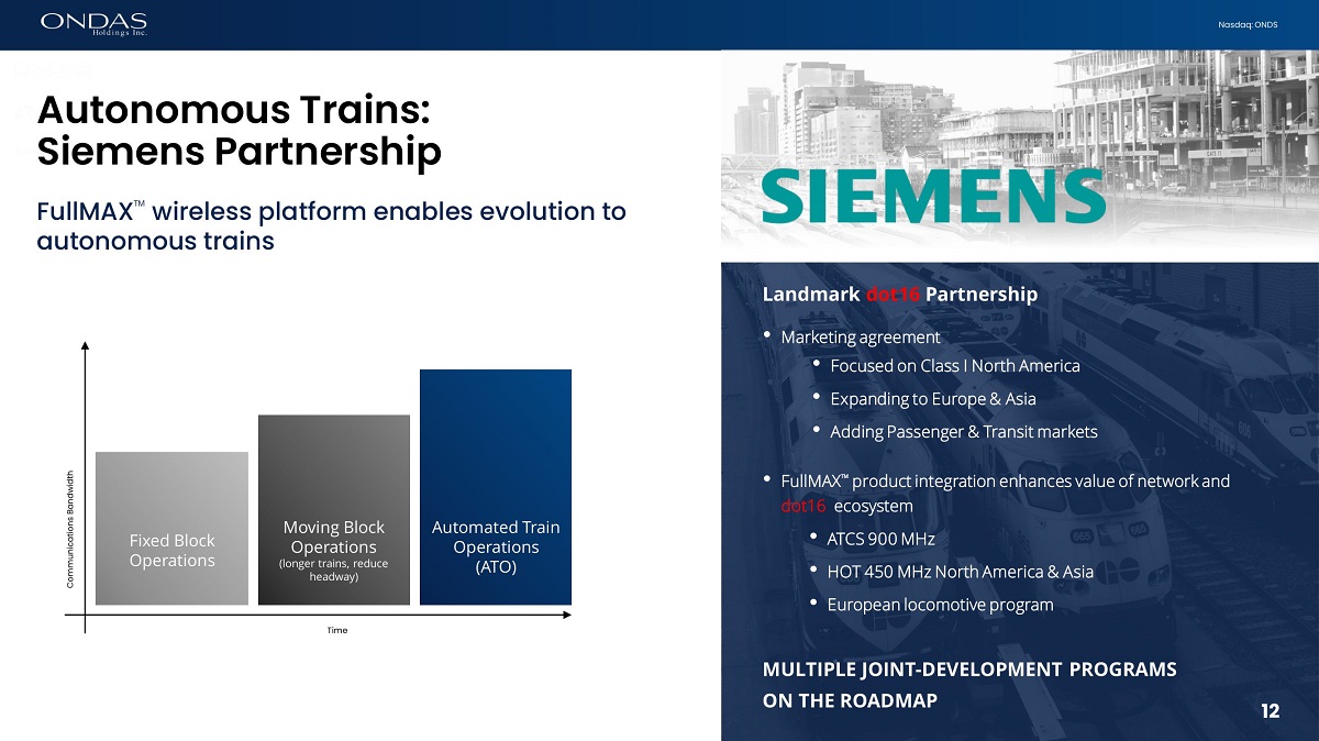 11 Nasdaq: ONDS RAILROAD INFRASTRUCTURE • Private, Owned & Operated • Secure, Reliable, QoS • Flexible; interoperable • Backwards compatible • Nationwide coverage • Lower cost PRIVATE NETWORKS Onboard Telemetry 450MHZ ATCS 900 MHz Voice 160 MHz PTC 220 MHz FCC Mandate Connectivity is Core to Digital Rail Private wireless networks required for existing and new applications; IP network supports explosion of edge activity
