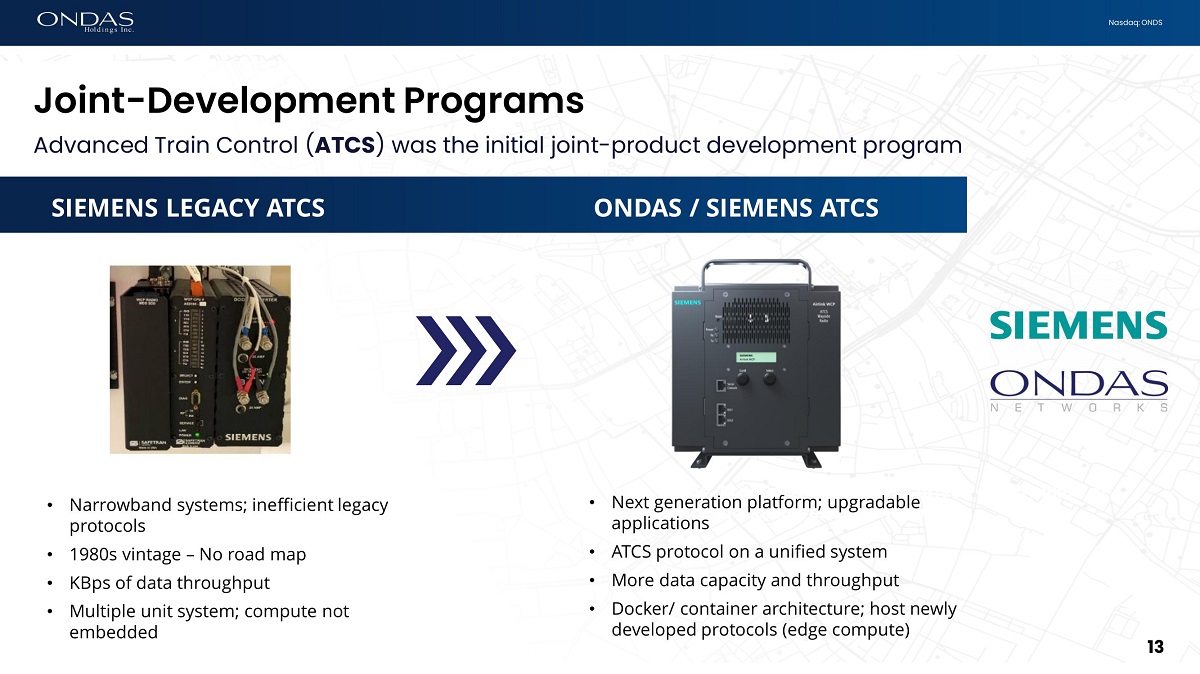12 Nasdaq: ONDS Landmark dot16 Partnership • Marketing agreement • Focused on Class I North America • Expanding to Europe & Asia • Adding Passenger & Transit markets • FullMAX Œ product integration enhances value of network and dot16 ecosystem • ATCS 900 MHz • HOT 450 MHz North America & Asia • European locomotive program MULTIPLE JOINT - DEVELOPMENT PROGRAMS ON THE ROADMAP Communications Bandwidth Time Fixed Block Operations Moving Block Operations (longer trains, reduce headway) Automated Train Operations (ATO) 12 FullMAX Œ wireless platform enables evolution to autonomous trains Autonomous Trains: Siemens Partnership