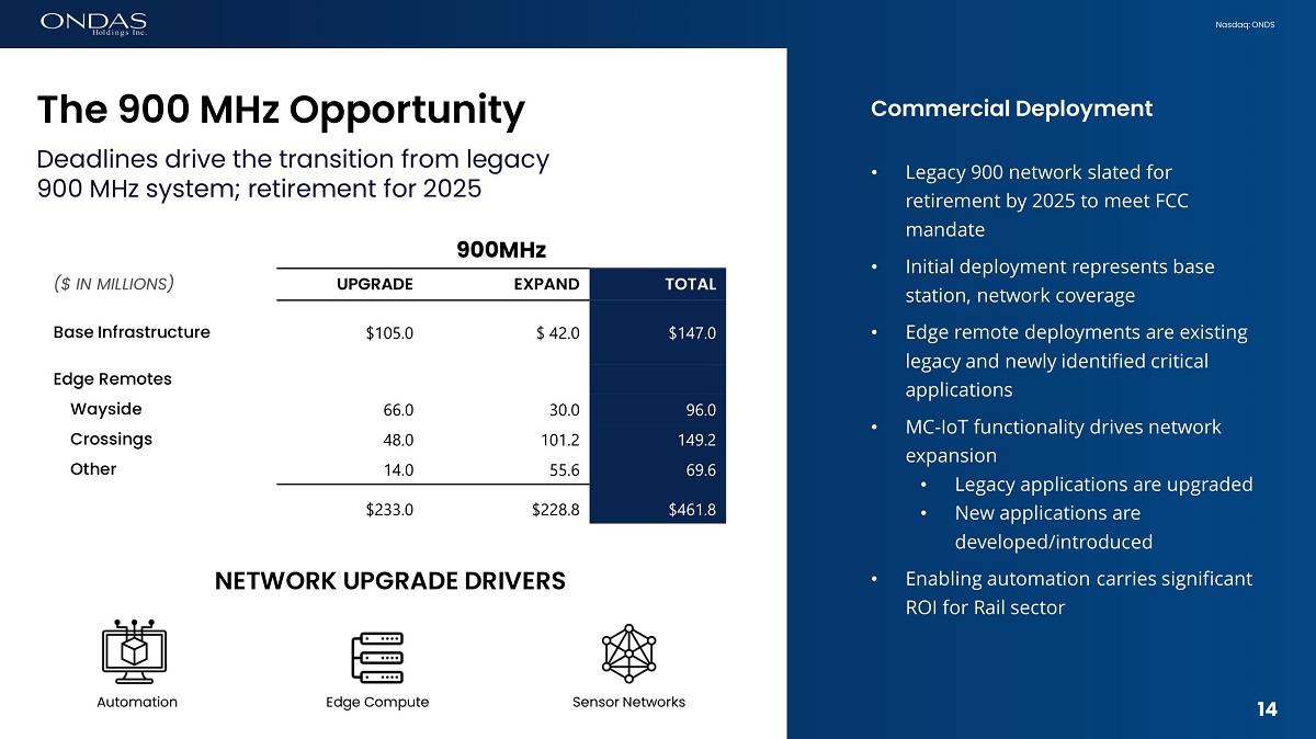13 Nasdaq: ONDS Joint - Development Programs • Narrowband systems; inefficient legacy protocols • 1980s vintage – No road map • KBps of data throughput • Multiple unit system; compute not embedded • Next generation platform; upgradable applications • ATCS protocol on a unified system • More data capacity and throughput • Docker/ container architecture; host newly developed protocols (edge compute) Advanced Train Control ( ATCS ) was the initial joint - product development program SIEMENS LEGACY ATCS ONDAS / SIEMENS ATCS
