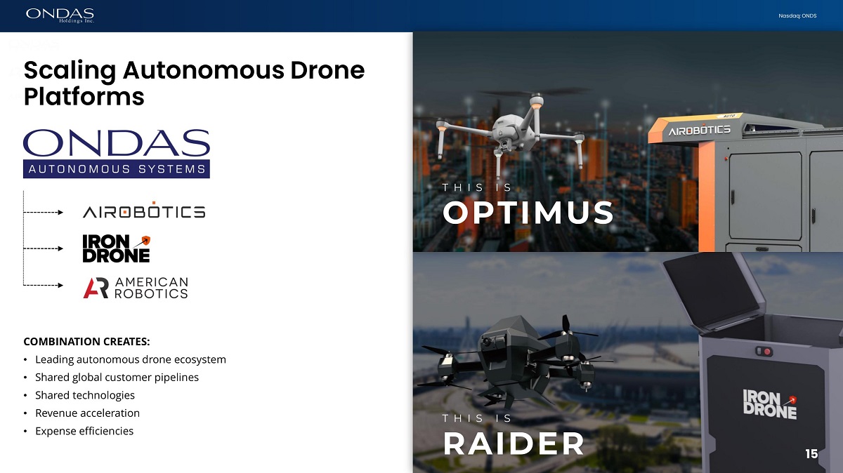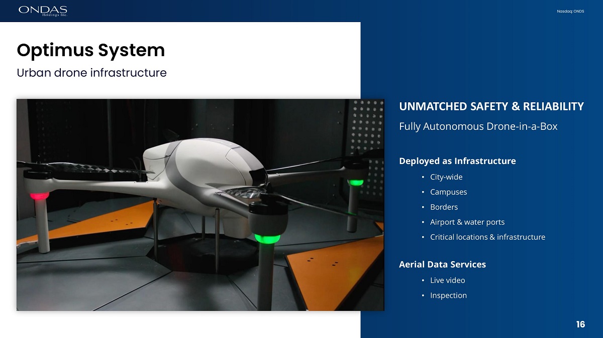 15 Nasdaq: ONDS T H I S I S RAIDER T H I S I S OPTIMUS COMBINATION CREATES: • Leading autonomous drone ecosystem • Shared global customer pipelines • Shared technologies • Revenue acceleration • Expense efficiencies Scaling Autonomous Drone Platforms 15