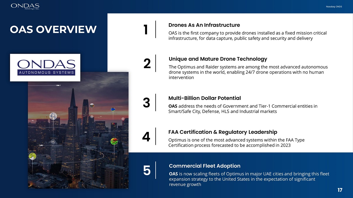 16 Nasdaq: ONDS UNMATCHED SAFETY & RELIABILITY Fully Autonomous Drone - in - a - Box Optimus System Urban drone infrastructure Deployed as Infrastructure • City - wide • Campuses • Borders • Airport & water ports • Critical locations & infrastructure Aerial Data Services • Live video • Inspection 16
