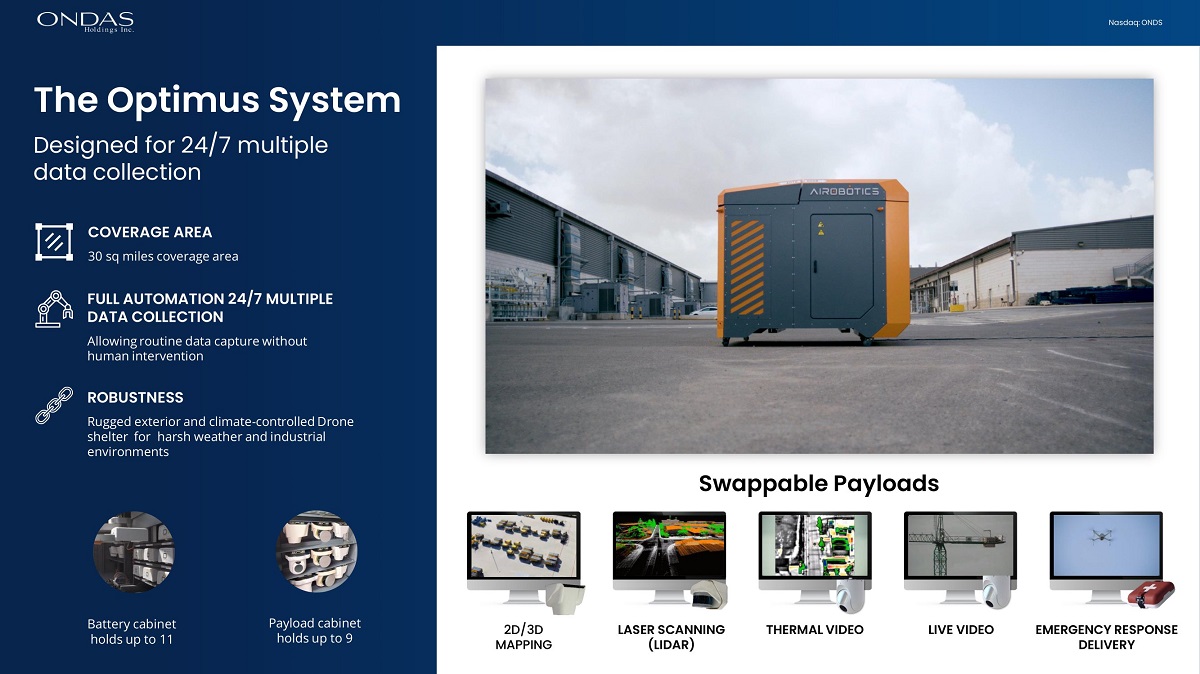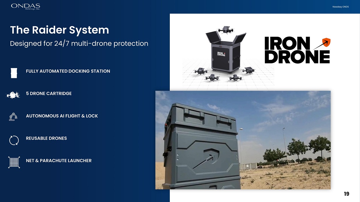 19 Nasdaq: ONDS 5 DRONE CARTRIDGE AUTONOMOUS AI FLIGHT & LOCK FULLY AUTOMATED DOCKING STATION NET & PARACHUTE LAUNCHER REUSABLE DRONES The Raider System Designed for 24/7 multi - drone protection 19