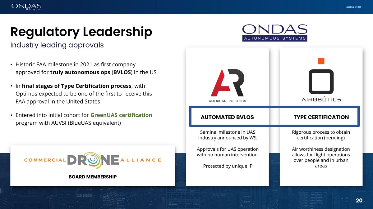 20 Nasdaq: ONDS Regulatory Leadership Industry leading approvals Seminal milestone in UAS industry announced by WSJ Approvals for UAS operation with no human intervention Protected by unique IP AUTOMATED BVLOS TYPE CERTIFICATION Rigorous process to obtain certification (pending) Air worthiness designation allows for flight operations over people and in urban areas • Historic FAA milestone in 2021 as first company approved for truly autonomous ops ( BVLOS ) in the US • In final stages of Type Certification process , with Optimus expected to be one of the first to receive this FAA approval in the United States • Entered into initial cohort for GreenUAS certification program with AUVSI (BlueUAS equivalent) 20 BOARD MEMBERSHIP