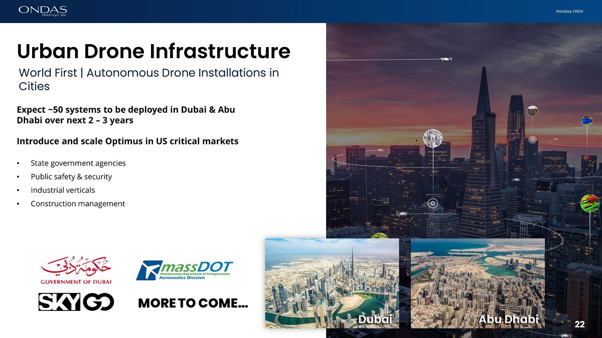 21 Nasdaq: ONDS Leading UAS Platforms Are Valuable (1) Disclaimer: This list is not exhaustive; valuations may differ based on a multitude of factors (2) Source: Estimates of total addressable market (TAM) based on various industry studies (3) Source: CapitalIQ; Based upon last available public report as of July 7, 2023 Markets Industrial, Urban, Security, and Defense Consumer, Infrastructure, Public Safety, and Defense Package Delivery Defense Urban Air Mobility Barriers to Entry HIGH MEDIUM MEDIUM MEDIUM HIGH Estimated Market Size (1) $120B $71B $32B $35B $58B Valuation (2) ~ $50M $2.2B $4.2B $8.5B ~ $6.3B Notable Investors
