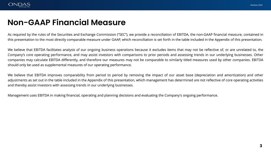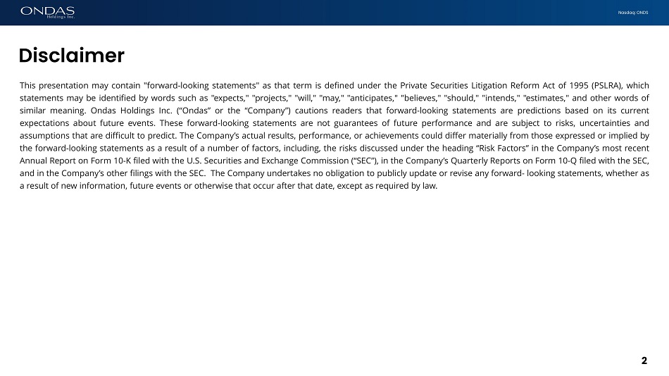 Nasdaq: ONDS This presentation may contain "forward - looking statements" as that term is defined under the Private Securities Litigation Reform Act of 1995 (PSLRA), which statements may be identified by words such as "expects," "projects," "will," "may," "anticipates," "believes," "should," "intends," "estimates," and other words of similar meaning . Ondas Holdings Inc . (“Ondas” or the “Company”) cautions readers that forward - looking statements are predictions based on its current expectations about future events . These forward - looking statements are not guarantees of future performance and are subject to risks, uncertainties and assumptions that are difficult to predict . The Company’s actual results, performance, or achievements could differ materially from those expressed or implied by the forward - looking statements as a result of a number of factors, including, the risks discussed under the heading “Risk Factors” in the Company’s most recent Annual Report on Form 10 - K filed with the U . S . Securities and Exchange Commission (“SEC”), in the Company’s Quarterly Reports on Form 10 - Q filed with the SEC, and in the Company’s other filings with the SEC . The Company undertakes no obligation to publicly update or revise any forward - looking statements, whether as a result of new information, future events or otherwise that occur after that date, except as required by law . 2 Disclaimer
