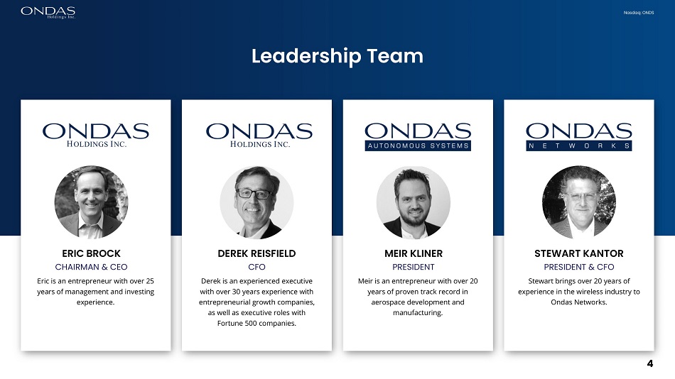 Nasdaq: ONDS As required by the rules of the Securities and Exchange Commission (“SEC”), we provide a reconciliation of EBITDA, the non - GAAP financial measure, contained in this presentation to the most directly comparable measure under GAAP, which reconciliation is set forth in the table included in the Appendix of this presentation . We believe that EBITDA facilitates analysis of our ongoing business operations because it excludes items that may not be reflective of, or are unrelated to, the Company’s core operating performance, and may assist investors with comparisons to prior periods and assessing trends in our underlying businesses . Other companies may calculate EBITDA differently, and therefore our measures may not be comparable to similarly titled measures used by other companies . EBITDA should only be used as supplemental measures of our operating performance . We believe that EBITDA improves comparability from period to period by removing the impact of our asset base (depreciation and amortization) and other adjustments as set out in the table included in the Appendix of this presentation, which management has determined are not reflective of core operating activities and thereby assist investors with assessing trends in our underlying businesses . Management uses EBITDA in making financial, operating and planning decisions and evaluating the Company's ongoing performance . 3 Non - GAAP Financial Measure