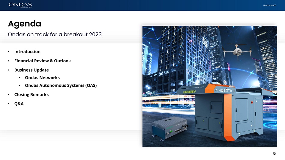 Nasdaq: ONDS Leadership Team DEREK REISFIELD CFO Derek is an experienced executive with over 30 years experience with entrepreneurial growth companies, as well as executive roles with Fortune 500 companies. ERIC BROCK CHAIRMAN & CEO Eric is an entrepreneur with over 25 years of management and investing experience. MEIR KLINER PRESIDENT Meir is an entrepreneur with over 20 years of proven track record in aerospace development and manufacturing. STEWART KANTOR PRESIDENT & CFO Stewart brings over 20 years of experience in the wireless industry to Ondas Networks. 4