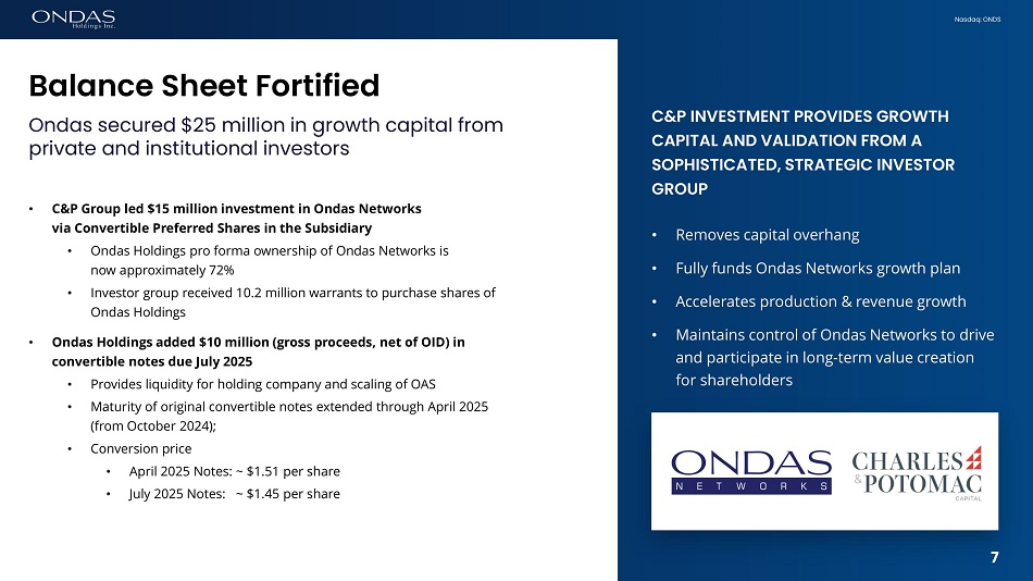 Nasdaq: ONDS Balance Sheet Fortified Ondas secured $25 million in growth capital from private and institutional investors • C&P Group led $15 million investment in Ondas Networks via Convertible Preferred Shares in the Subsidiary • Ondas Holdings pro forma ownership of Ondas Networks is now approximately 72% • Investor group received 10.2 million warrants to purchase shares of Ondas Holdings • Ondas Holdings added $10 million (gross proceeds, net of OID) in convertible notes due July 2025 • Provides liquidity for holding company and scaling of OAS • Maturity of original convertible notes extended through April 2025 (from October 2024); • Conversion price • April 2025 Notes: ~ $1.51 per share • July 2025 Notes: ~ $1.45 per share C&P INVESTMENT PROVIDES GROWTH CAPITAL AND VALIDATION FROM A SOPHISTICATED, STRATEGIC INVESTOR GROUP • Removes capital overhang • Fully funds Ondas Networks growth plan • Accelerates production & revenue growth • Maintains control of Ondas Networks to drive and participate in long - term value creation for shareholders 6 7