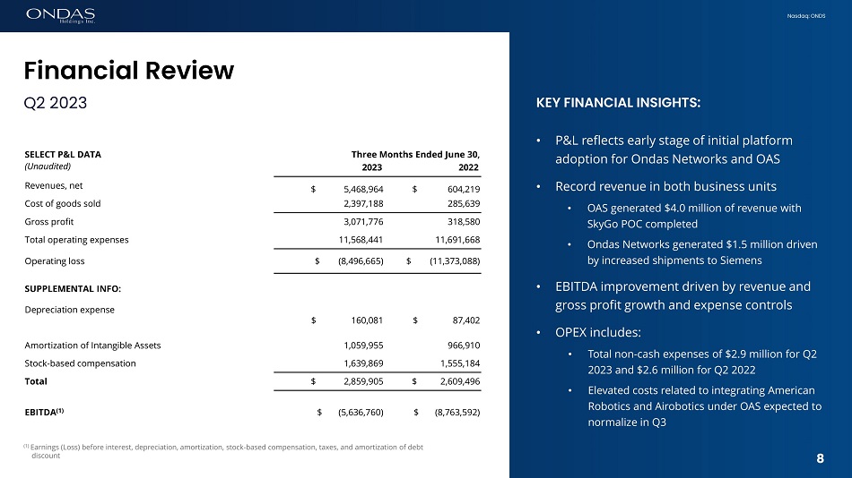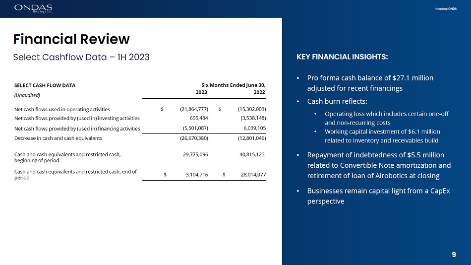 8 Nasdaq: ONDS KEY FINANCIAL INSIGHTS: • P&L reflects early stage of initial platform adoption for Ondas Networks and OAS • Record revenue in both business units • OAS generated $4.0 million of revenue with SkyGo POC completed • Ondas Networks generated $1.5 million driven by increased shipments to Siemens • EBITDA improvement driven by revenue and gross profit growth and expense controls • OPEX includes: • Total non - cash expenses of $2.9 million for Q2 2023 and $2.6 million for Q2 2022 • Elevated costs related to integrating American Robotics and Airobotics under OAS expected to normalize in Q3 SELECT P&L DATA Three Months Ended June 30, (Unaudited) 2023 2022 Revenues, net $ 5,468,964 $ 604,219 Cost of goods sold 2,397,188 285,639 Gross profit 3,071,776 318,580 Total operating expenses 11,568,441 11,691,668 Operating loss $ (8,496,665) $ (11,373,088) SUPPLEMENTAL INFO: Depreciation expense $ 160,081 $ 87,402 Amortization of Intangible Assets 1,059,955 966,910 Stock - based compensation 1,639,869 1,555,184 Total $ 2,859,905 $ 2,609,496 EBITDA (1) $ (5,636,760) $ (8,763,592) (1) Earnings (Loss) before interest, depreciation, amortization, stock - based compensation, taxes, and amortization of debt discount Financial Review Q2 2023 8