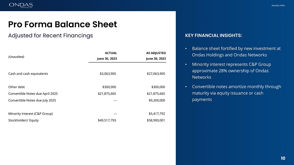 Nasdaq: ONDS KEY FINANCIAL INSIGHTS: • Pro forma cash balance of $27.1 million adjusted for recent financings • Cash burn reflects: • Operating loss which includes certain one - off and non - recurring costs • Working capital investment of $6.0 million related to inventory and receivables build • Repayment of indebtedness of $5.5 million related to Convertible Note amortization and retirement of loan of Airobotics at closing • Businesses remain capital light from a CapEx perspective SELECT CASH FLOW DATA Six Months Ended June 30, (Unaudited) 2023 2022 Net cash flows used in operating activities $ (21,864,777) $ (15,302,003) Net cash flows provided by (used in) investing activities 695,484 (3,538,148) Net cash flows provided by (used in) financing activities (5,501,087) 6,039,105 Decrease in cash and cash equivalents (26,670,380) (12,801,046) Cash and cash equivalents and restricted cash, beginning of period 29,775,096 40,815,123 Cash and cash equivalents and restricted cash, end of period $ 3,104,716 $ 28,014,077 9 9 Financial Review Select Cashflow Data – 1H 2023