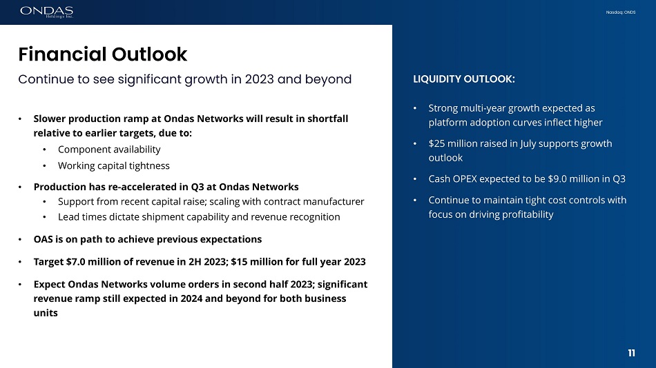 Nasdaq: ONDS KEY FINANCIAL INSIGHTS: • Balance sheet fortified by new investment at Ondas Holdings and Ondas Networks • Minority interest represents C&P Group approximate 28% ownership of Ondas Networks • Convertible notes amortize monthly through maturity via equity issuance or cash payments 9 10 Pro Forma Balance Sheet Adjusted for Recent Financings ACTUAL AS ADJUSTED (Unaudited) June 30, 2023 June 30, 2023 Cash and cash equivalents $3,063,905 $27,063,905 Other debt $300,000 $300,000 Convertible Notes due April 2025 $21,875,665 $21,875,665 Convertible Notes due July 2025 -- - $9,200,000 Minority Interest (C&P Group) -- - $5,417,792 Stockholders' Equity $49,517,793 $58,900,001