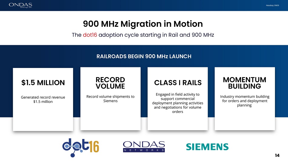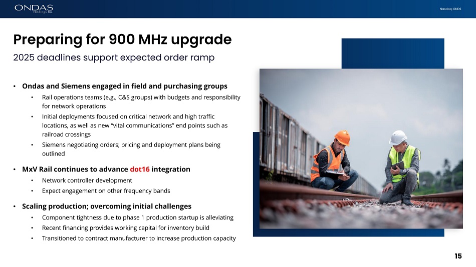 Nasdaq: ONDS Preparing for 900 MHz upgrade 15 2025 deadlines support expected order ramp • Ondas and Siemens engaged in field and purchasing groups • Rail operations teams (e.g., C&S groups) with budgets and responsibility for network operations • Initial deployments focused on critical network and high traffic locations, as well as new “vital communications” end points such as railroad crossings • Siemens negotiating orders; pricing and deployment plans being outlined • MxV Rail continues to advance dot16 integration • Network controller development • Expect engagement on other frequency bands • Scaling production; overcoming initial challenges • Component tightness due to phase 1 production startup is alleviating • Recent financing provides working capital for inventory build • Transitioned to contract manufacturer to increase production capacity