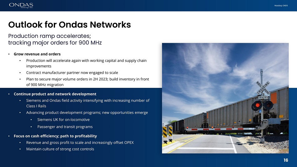 Nasdaq: ONDS New photo Outlook for Ondas Networks Production ramp accelerates; tracking major orders for 900 MHz • Grow revenue and orders • Production will accelerate again with working capital and supply chain improvements • Contract manufacturer partner now engaged to scale • Plan to secure major volume orders in 2H 2023; build inventory in front of 900 MHz migration • Continue product and network development • Siemens and Ondas field activity intensifying with increasing number of Class I Rails • Advancing product development programs; new opportunities emerge • Siemens UK for on - locomotive • Passenger and transit programs • Focus on cash efficiency; path to profitability • Revenue and gross profit to scale and increasingly offset OPEX 16 • Maintain culture of strong cost controls 16