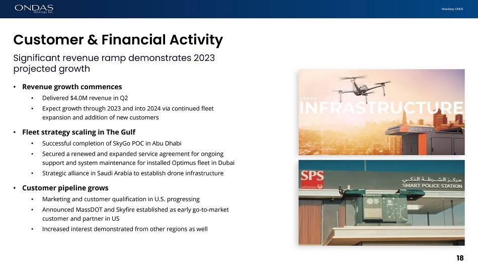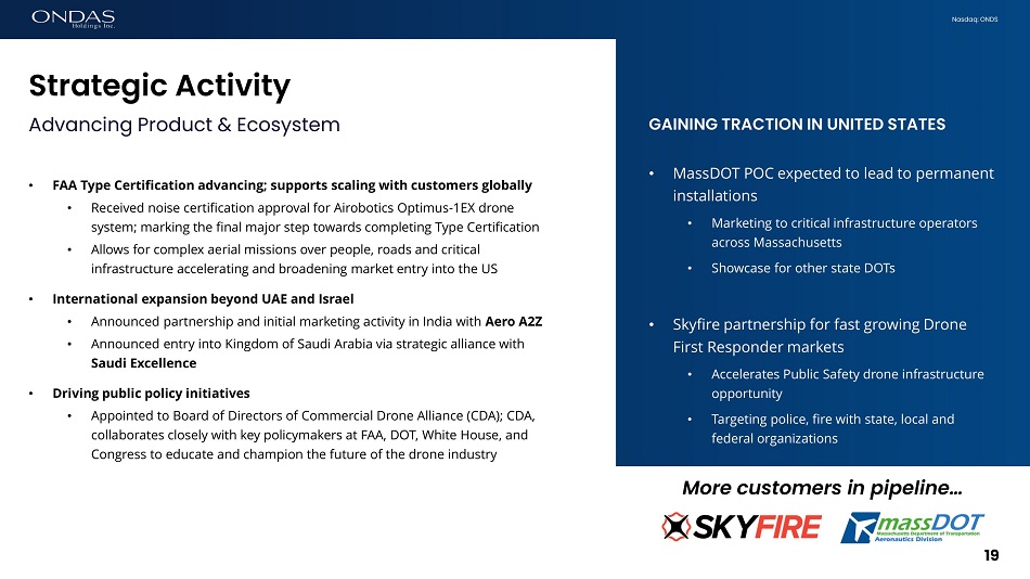 Nasdaq: ONDS Customer & Financial Activity 18 Significant revenue ramp demonstrates 2023 projected growth • Revenue growth commences • Delivered $4.0M revenue in Q2 • Expect growth through 2023 and into 2024 via continued fleet expansion and addition of new customers • Fleet strategy scaling in The Gulf • Successful completion of SkyGo POC in Abu Dhabi • Secured a renewed and expanded service agreement for ongoing support and system maintenance for installed Optimus fleet in Dubai • Strategic alliance in Saudi Arabia to establish drone infrastructure • Customer pipeline grows • Marketing and customer qualification in U.S. progressing • Announced MassDOT and Skyfire established as early go - to - market customer and partner in US • Increased interest demonstrated from other regions as well
