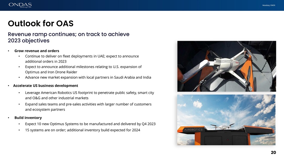 Nasdaq: ONDS Outlook for OAS 20 Revenue ramp continues; on track to achieve 2023 objectives • Grow revenue and orders • Continue to deliver on fleet deployments in UAE; expect to announce additional orders in 2023 • Expect to announce additional milestones relating to U.S. expansion of Optimus and Iron Drone Raider • Advance new market expansion with local partners in Saudi Arabia and India • Accelerate US business development • Leverage American Robotics US footprint to penetrate public safety, smart city and O&G and other industrial markets • Expand sales teams and pre - sales activities with larger number of customers and ecosystem partners • Build inventory • Expect 10 new Optimus Systems to be manufactured and delivered by Q4 2023 • 15 systems are on order; additional inventory build expected for 2024