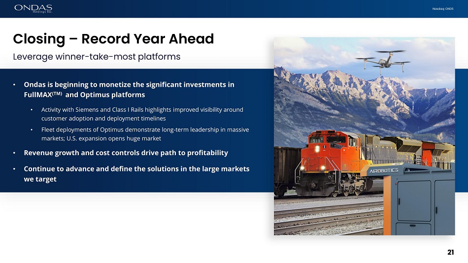Nasdaq: ONDS • Ondas is beginning to monetize the significant investments in FullMAX (TM) and Optimus platforms • Activity with Siemens and Class I Rails highlights improved visibility around customer adoption and deployment timelines • Fleet deployments of Optimus demonstrate long - term leadership in massive markets; U.S. expansion opens huge market • Revenue growth and cost controls drive path to profitability • Continue to advance and define the solutions in the large markets we target Closing – Record Year Ahead 21 Leverage winner - take - most platforms