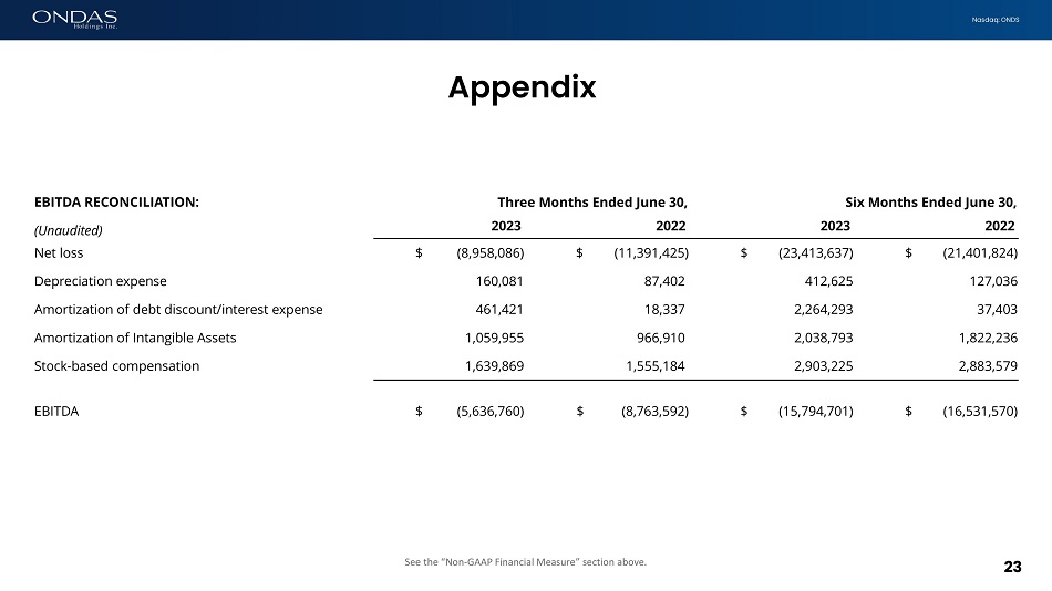 Nasdaq: ONDS Appendix 23 See the “Non - GAAP Financial Measure” section above. EBITDA RECONCILIATION: Three Months Ended June 30, Six Months Ended June 30, (Unaudited) 2023 2022 2023 2022 Net loss $ (8,958,086) $ (11,391,425) $ (23,413,637) $ (21,401,824) Depreciation expense 160,081 87,402 412,625 127,036 Amortization of debt discount/interest expense 461,421 18,337 2,264,293 37,403 Amortization of Intangible Assets 1,059,955 966,910 2,038,793 1,822,236 Stock - based compensation 1,639,869 1,555,184 2,903,225 2,883,579 EBITDA $ (5,636,760) $ (8,763,592) $ (15,794,701) $ (16,531,570)