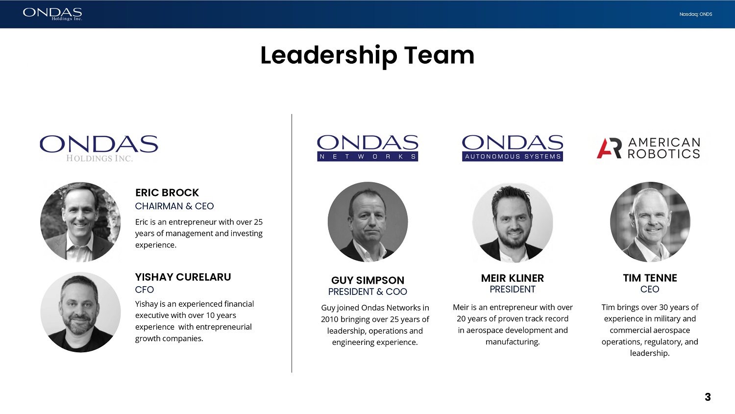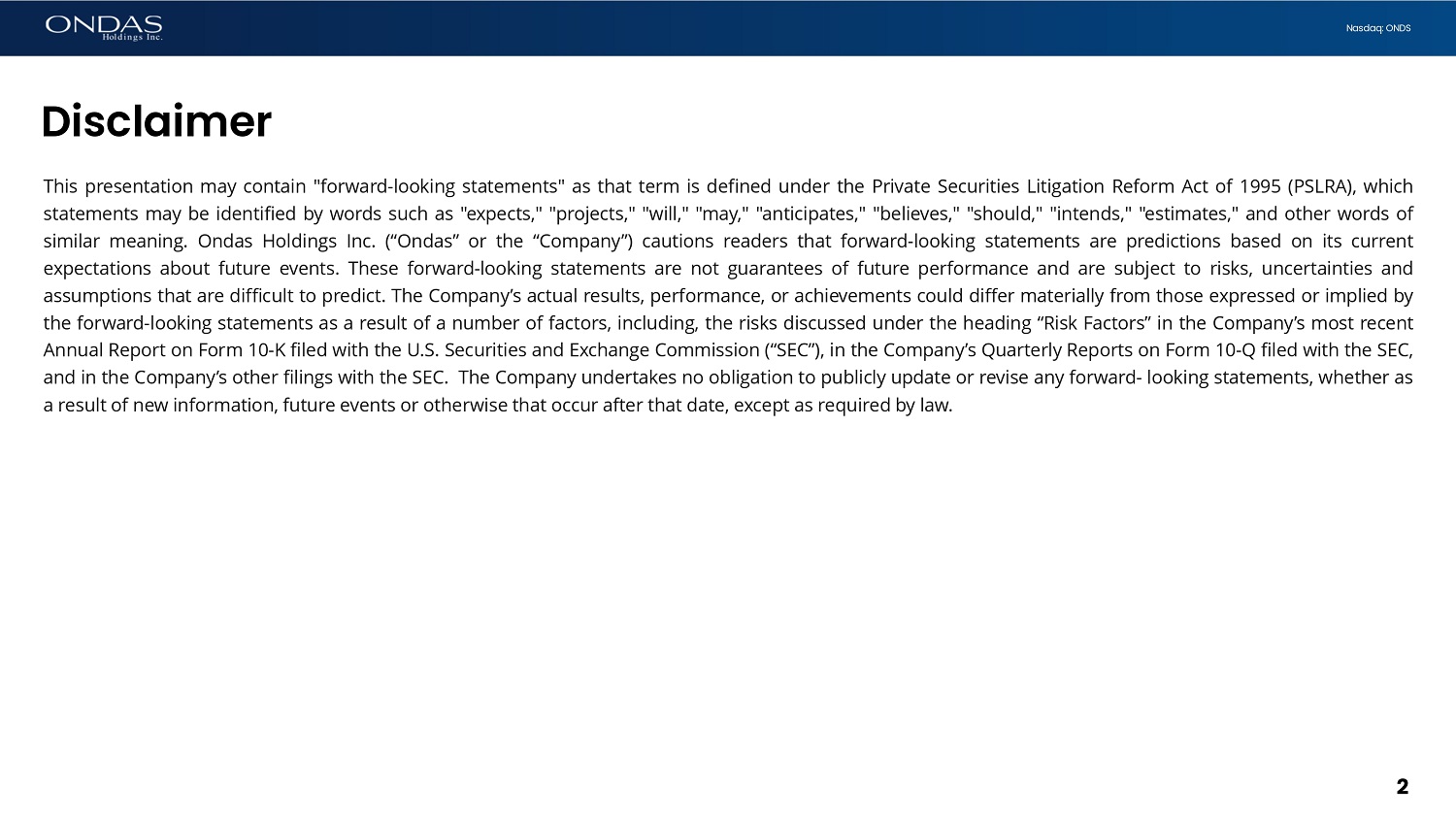 2 Nasdaq: ONDS This presentation may contain "forward - looking statements" as that term is defined under the Private Securities Litigation Reform Act of 1995 (PSLRA), which statements may be identified by words such as "expects," "projects," "will," "may," "anticipates," "believes," "should," "intends," "estimates," and other words of similar meaning . Ondas Holdings Inc . (“Ondas” or the “Company”) cautions readers that forward - looking statements are predictions based on its current expectations about future events . These forward - looking statements are not guarantees of future performance and are subject to risks, uncertainties and assumptions that are difficult to predict . The Company’s actual results, performance, or achievements could differ materially from those expressed or implied by the forward - looking statements as a result of a number of factors, including, the risks discussed under the heading “Risk Factors” in the Company’s most recent Annual Report on Form 10 - K filed with the U . S . Securities and Exchange Commission (“SEC”), in the Company’s Quarterly Reports on Form 10 - Q filed with the SEC, and in the Company’s other filings with the SEC . The Company undertakes no obligation to publicly update or revise any forward - looking statements, whether as a result of new information, future events or otherwise that occur after that date, except as required by law . Disclaimer