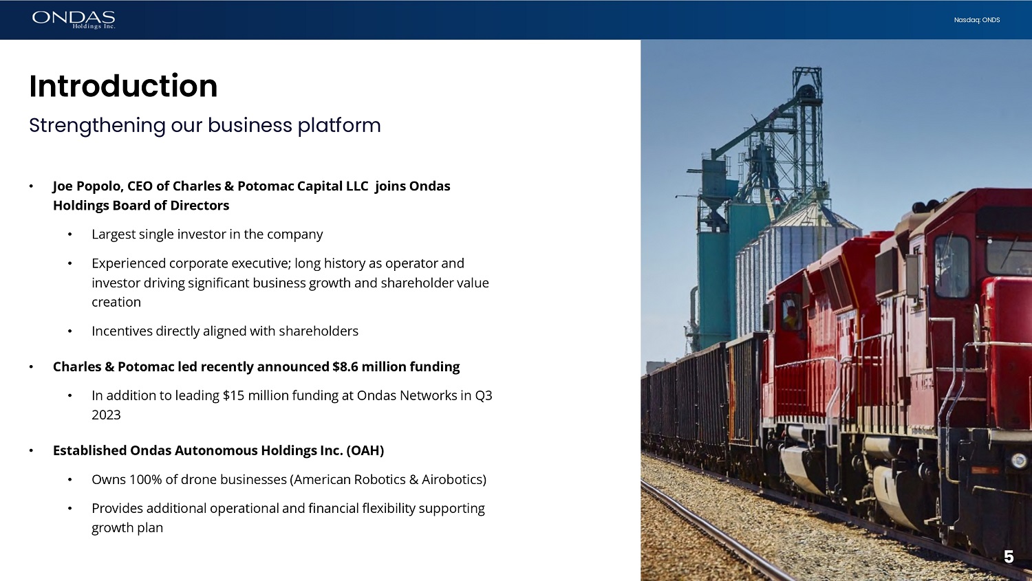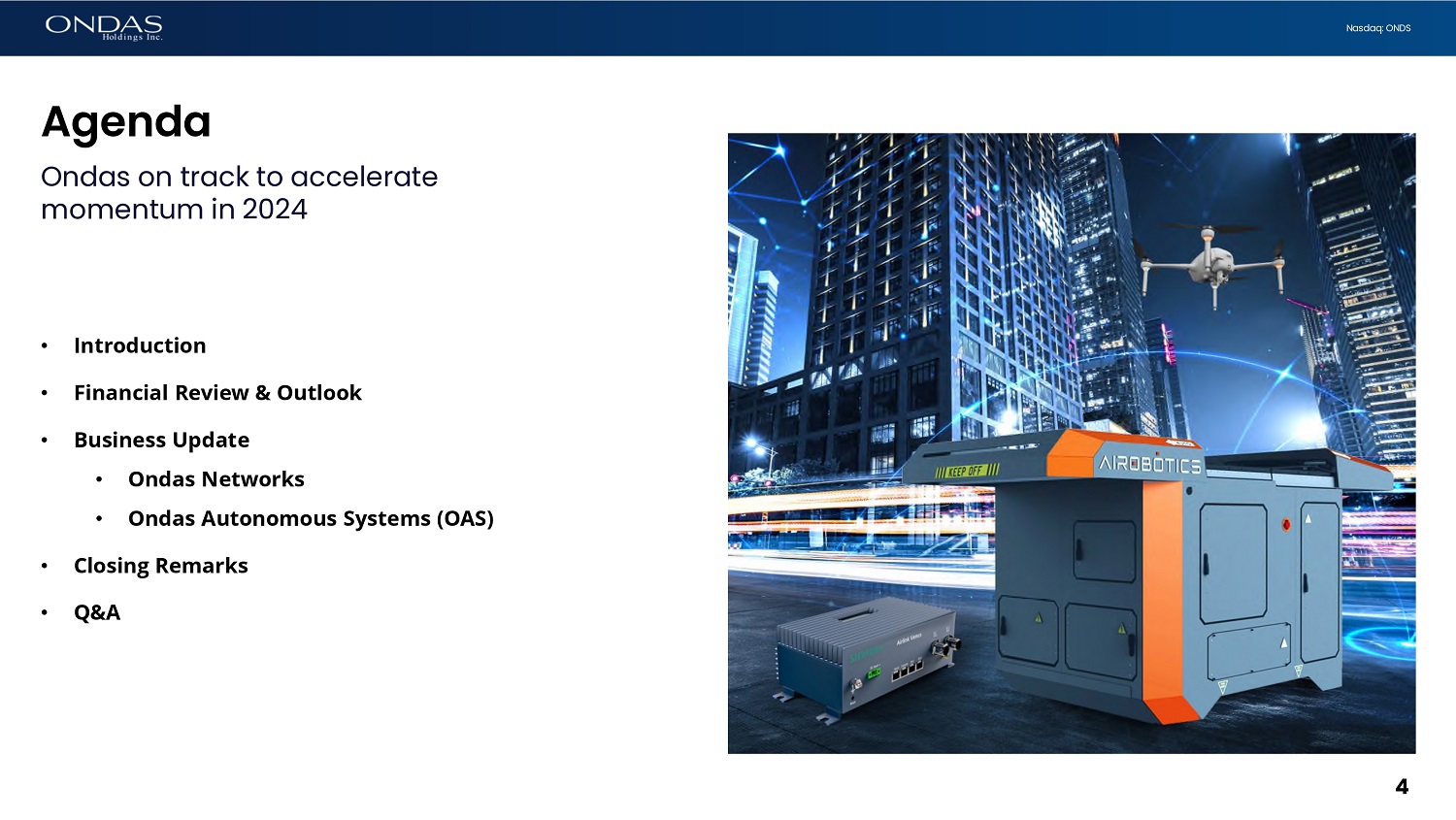 4 Nasdaq: ONDS Agenda Ondas on track to accelerate momentum in 2024 • Introduction • Financial Review & Outlook • Business Update • Ondas Networks • Ondas Autonomous Systems (OAS) • Closing Remarks • Q&A