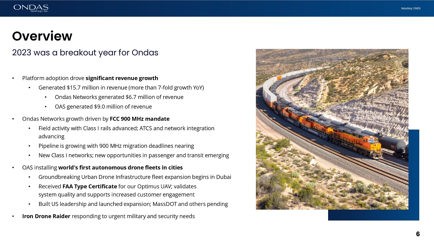 5 Nasdaq: ONDS 5 Introduction Strengthening our business platform • Joe Popolo , CEO of Charles & Potomac Capital LLC joins Ondas Holdings Board of Directors • Largest single investor in the company • Experienced corporate executive; long history as operator and investor driving significant business growth and shareholder value creation • Incentives directly aligned with shareholders • Charles & Potomac led recently announced $8.6 million funding • In addition to leading $15 million funding at Ondas Networks in Q3 2023 • Established Ondas Autonomous Holdings Inc. (OAH) • Owns 100% of drone businesses (American Robotics & Airobotics) • Provides additional operational and financial flexibility supporting growth plan