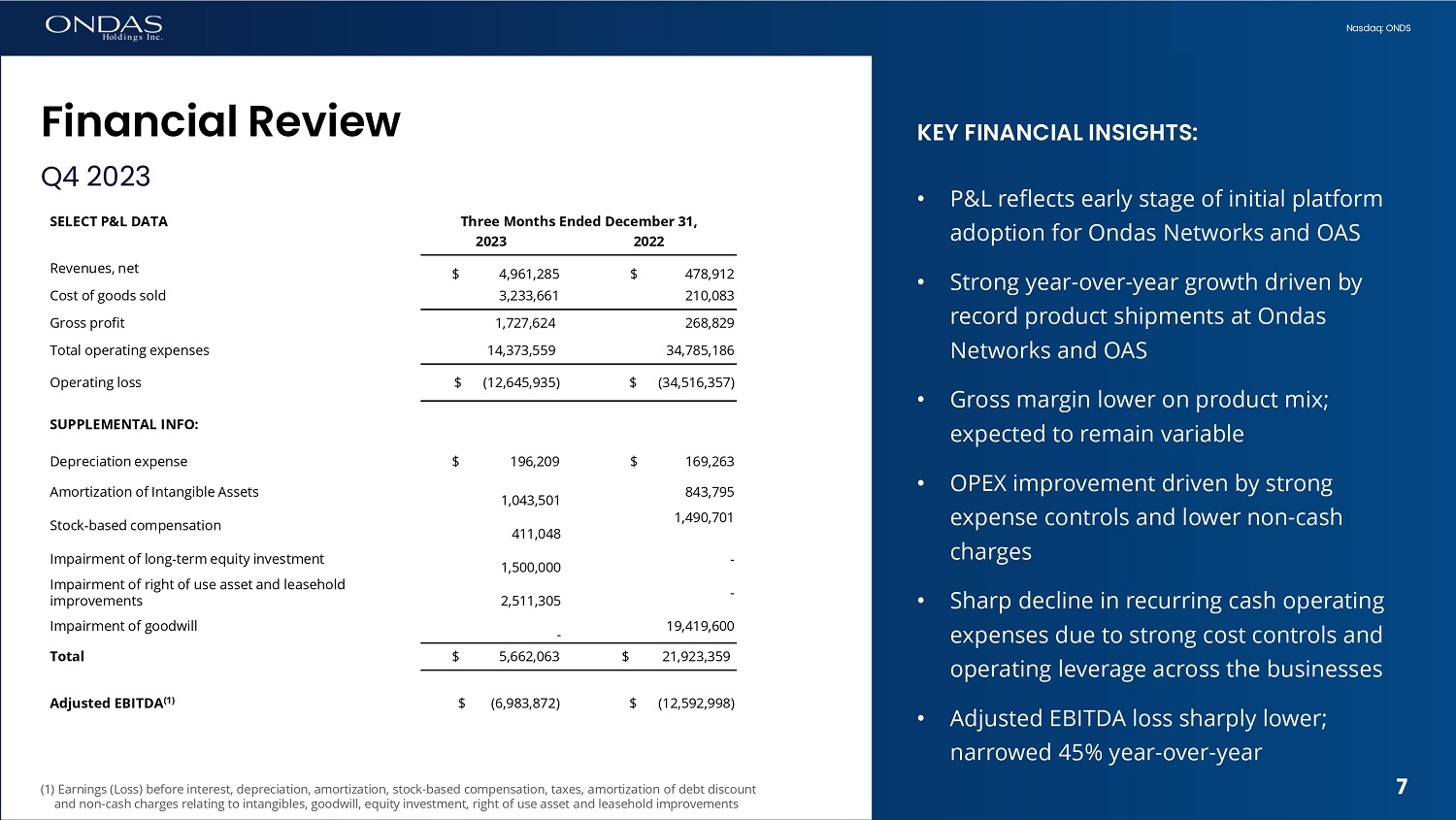 6 Nasdaq: ONDS Overview 2023 was a breakout year for Ondas • Platform adoption drove significant revenue growth • Generated $15.7 million in revenue (more than 7 - fold growth YoY) • Ondas Networks generated $6.7 million of revenue • OAS generated $9.0 million of revenue • Ondas Networks growth driven by FCC 900 MHz mandate • Field activity with Class I rails advanced; ATCS and network integration advancing • Pipeline is growing with 900 MHz migration deadlines nearing • New Class I networks; new opportunities in passenger and transit emerging • OAS installing world's first autonomous drone fleets in cities • Groundbreaking Urban Drone Infrastructure fleet expansion begins in Dubai • Received FAA Type Certificate for our Optimus UAV; validates system quality and supports increased customer engagement • Built US leadership and launched expansion; MassDOT and others pending • Iron Drone Raider responding to urgent military and security needs