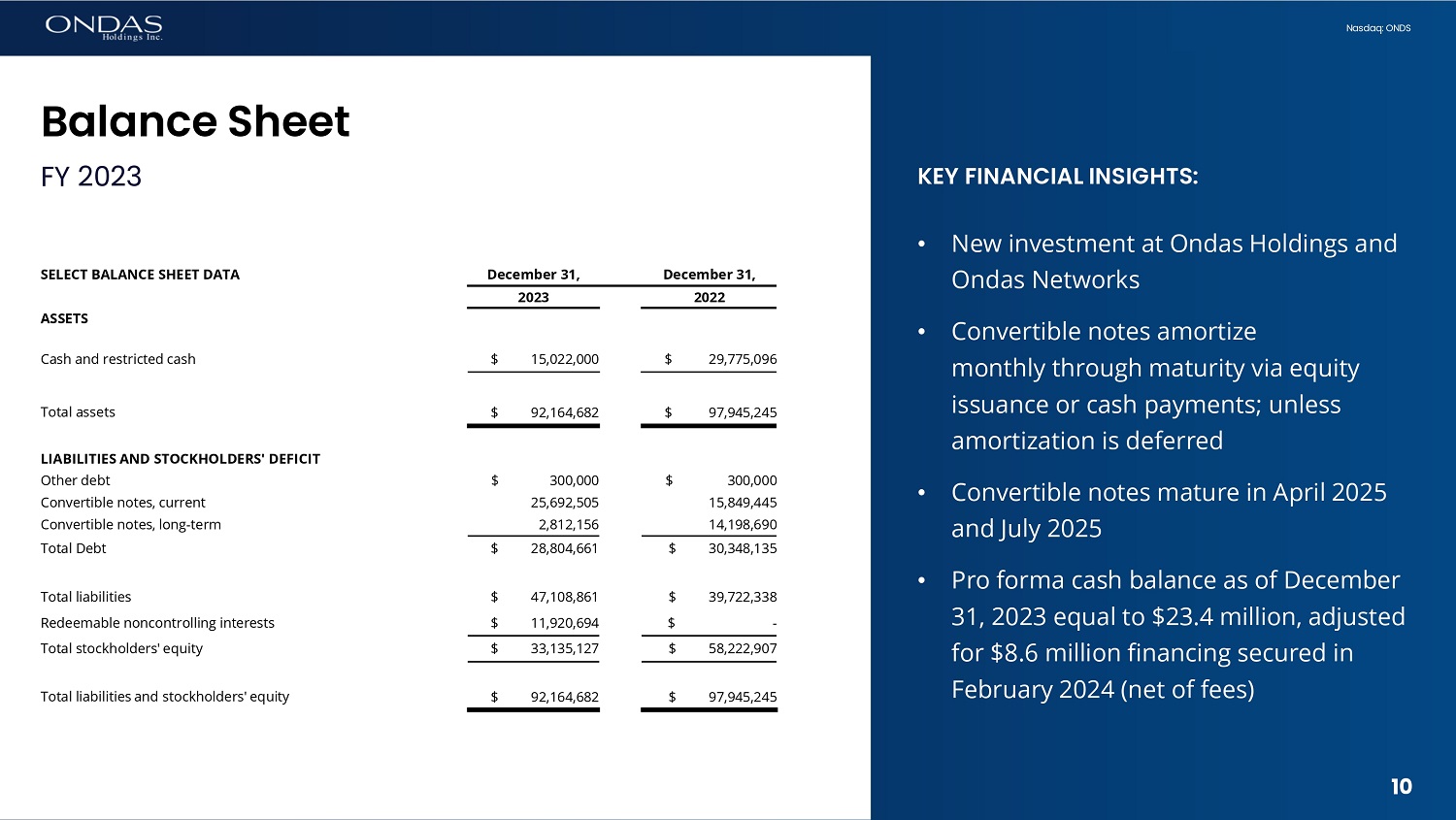9 Nasdaq: ONDS KEY FINANCIAL INSIGHTS: • Cash balance of $15.0 million • Operating cash burn includes working capital investment of $3.9 million • Cash provided by financing includes: • $24 million net proceeds raised during the third quarter at Ondas Holdings (convertible notes) and Ondas Networks (preferred stock) • Cash repayment of indebtedness of $5.5 million Financial Review FY 2023 9 Twelve Months Ended December 31, SELECT CASH FLOW DATA 2022 2023 $ (37,963,076) $ (34,019,519) Net cash used in operating activities (6,934,568) 536,273 Net cash provided by (used in) investing activities 33,857,617 18,730,150 Net cash provided by financing activities (11,040,027) (14,753,096) Decrease in cash 40,815,123 29,775,096 Cash, cash equivalents and restricted cash, beginning of period $ 29,775,096 $ 15,022,000 Cash , cash equivalents and restricted cash , end of periodEB0