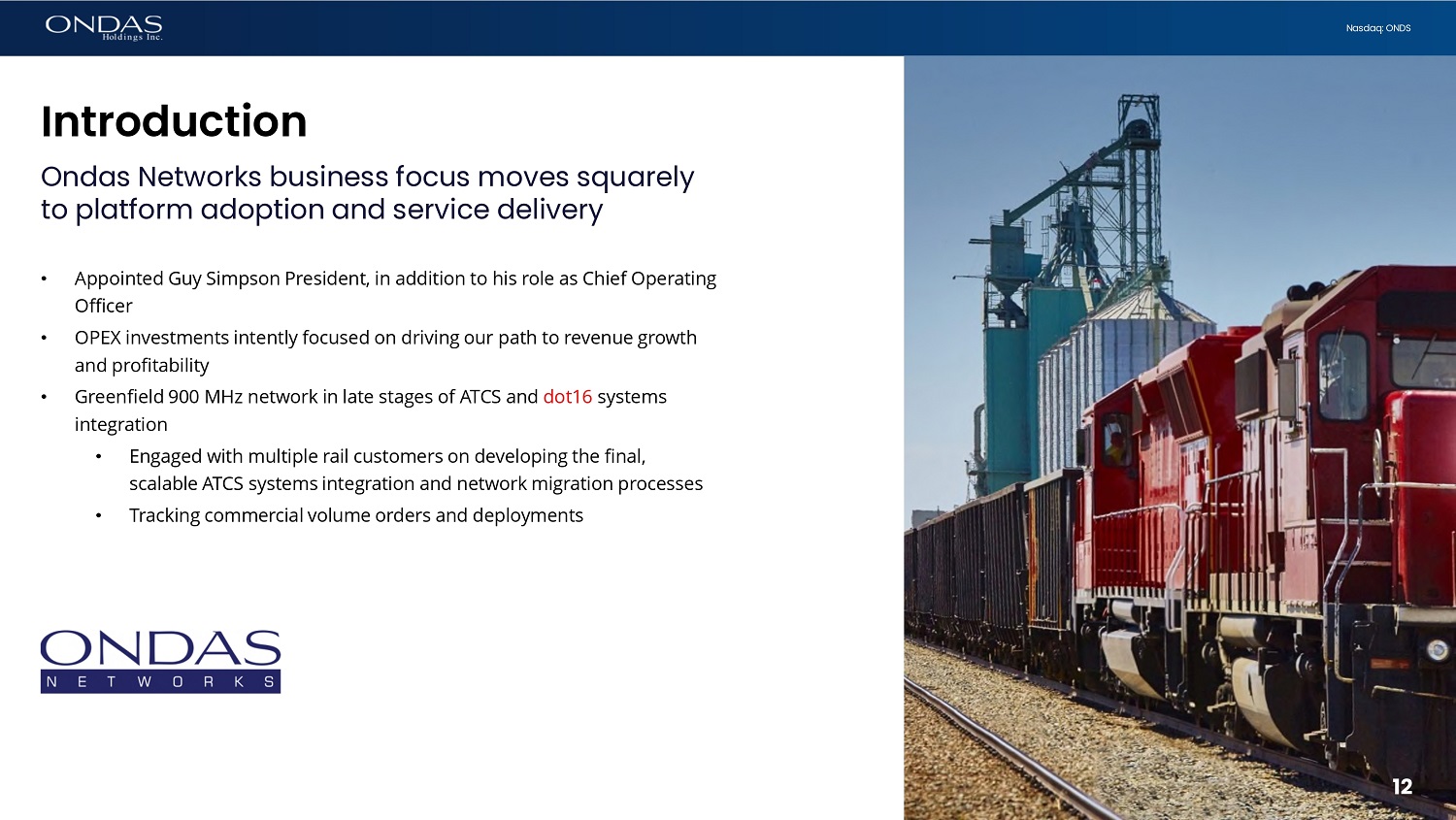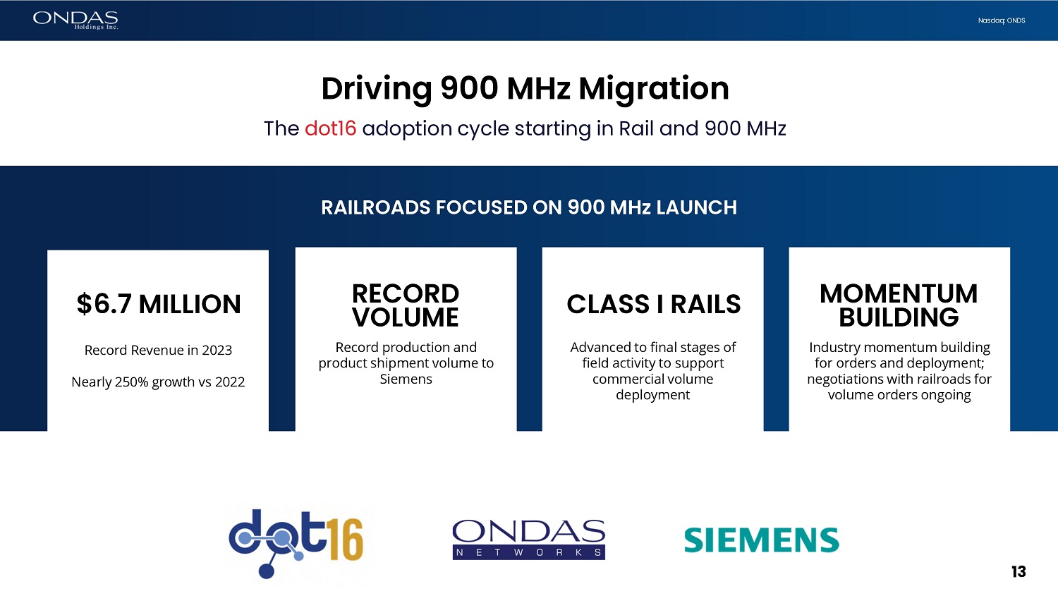 12 Nasdaq: ONDS • Appointed Guy Simpson President, in addition to his role as Chief Operating Officer • OPEX investments intently focused on driving our path to revenue growth and profitability • Greenfield 900 MHz network in late stages of ATCS and dot16 systems integration • Engaged with multiple rail customers on developing the final, scalable ATCS systems integration and network migration processes • Tracking commercial volume orders and deployments 12 Introduction Ondas Networks business focus moves squarely to platform adoption and service delivery