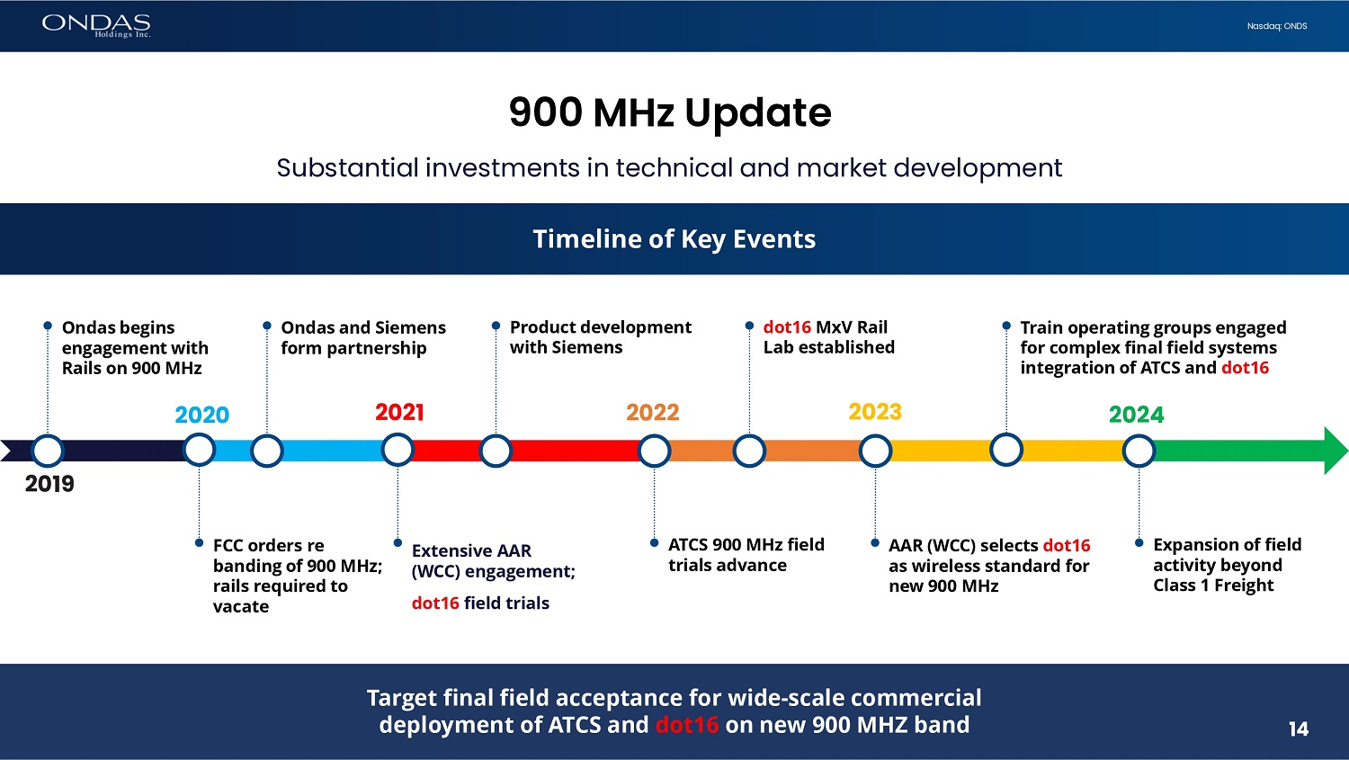 13 Nasdaq: ONDS Industry momentum building for orders and deployment; negotiations with railroads for volume orders ongoing Advanced to final stages of field activity to support commercial volume deployment Record production and product shipment volume to Siemens Record Revenue in 2023 Nearly 250 % growth vs 2022 RAILROADS FOCUSED ON 900 MHz LAUNCH $6.7 MILLION RECORD VOLUME CLASS I RAILS MOMENTUM BUILDING Driving 900 MHz Migration The dot16 adoption cycle starting in Rail and 900 MHz