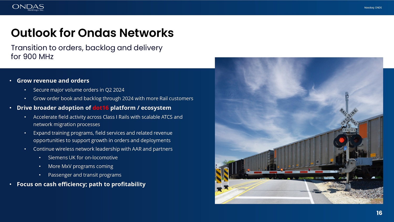 15 Nasdaq: ONDS 900 MHz – ATCS & dot16 2025 deadlines support expected order ramp • Ondas and Siemens engaged with final SYSTEM integration and migration activities • In late stages demonstrating the scalable processes related to ATCS systems integration and network migration to dot16 protocols • Addressing challenges to integrate applications with multiple legacy technologies in complex rail infrastructure systems all the way to back - office • Orders expected upon acceptance of ATCS and network integration • Initial orders for metropolitan rollout; broader system - wide to follow • Expect initial rail deployments are a catalyst for other Rails to engage on network planning and order • Commuter and transit customer are also engaged in field work/ order planning • Conversations with Railroads suggest FCC deadlines are in focus