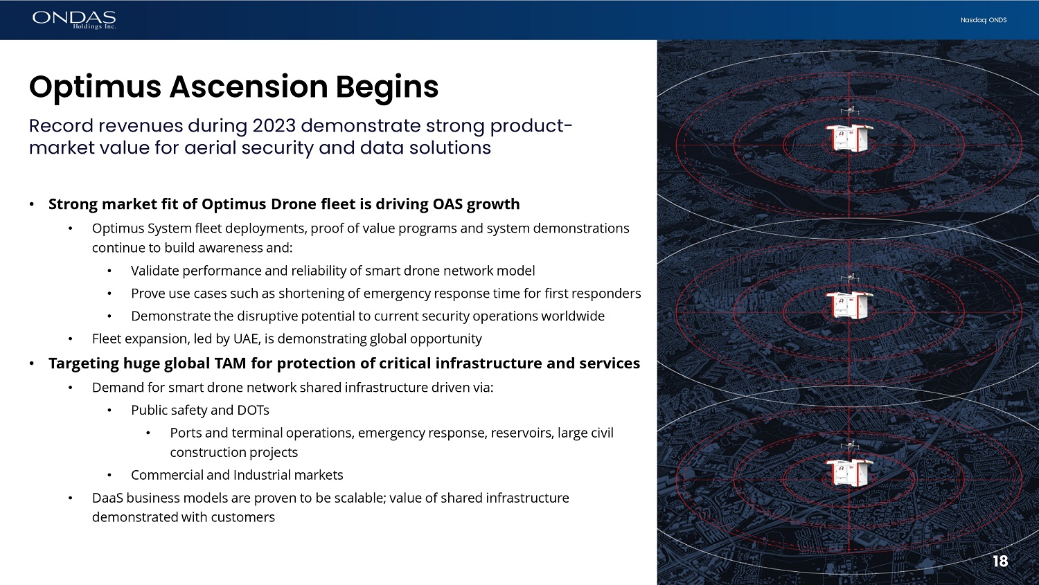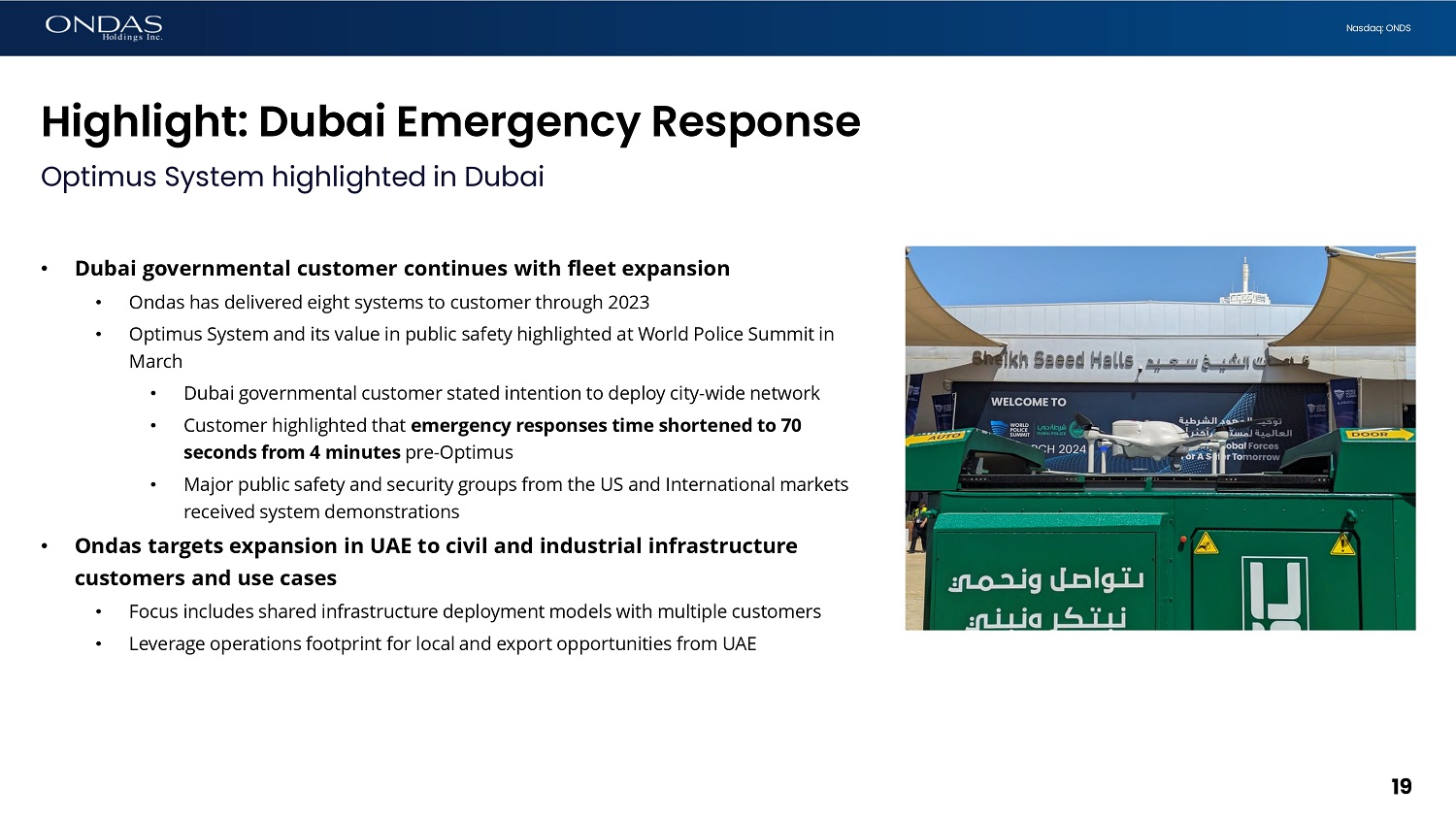 18 Nasdaq: ONDS Optimus Ascension Begins Record revenues during 2023 demonstrate strong product - market value for aerial security and data solutions • Strong market fit of Optimus Drone fleet is driving OAS growth • Optimus System fleet deployments, proof of value programs and system demonstrations continue to build awareness and: • Validate performance and reliability of smart drone network model • Prove use cases such as shortening of emergency response time for first responders • Demonstrate the disruptive potential to current security operations worldwide • Fleet expansion, led by UAE, is demonstrating global opportunity • Targeting huge global TAM for protection of critical infrastructure and services • Demand for smart drone network shared infrastructure driven via: • Public safety and DOTs • Ports and terminal operations, emergency response, reservoirs, large civil construction projects • Commercial and Industrial markets • DaaS business models are proven to be scalable; value of shared infrastructure demonstrated with customers 18