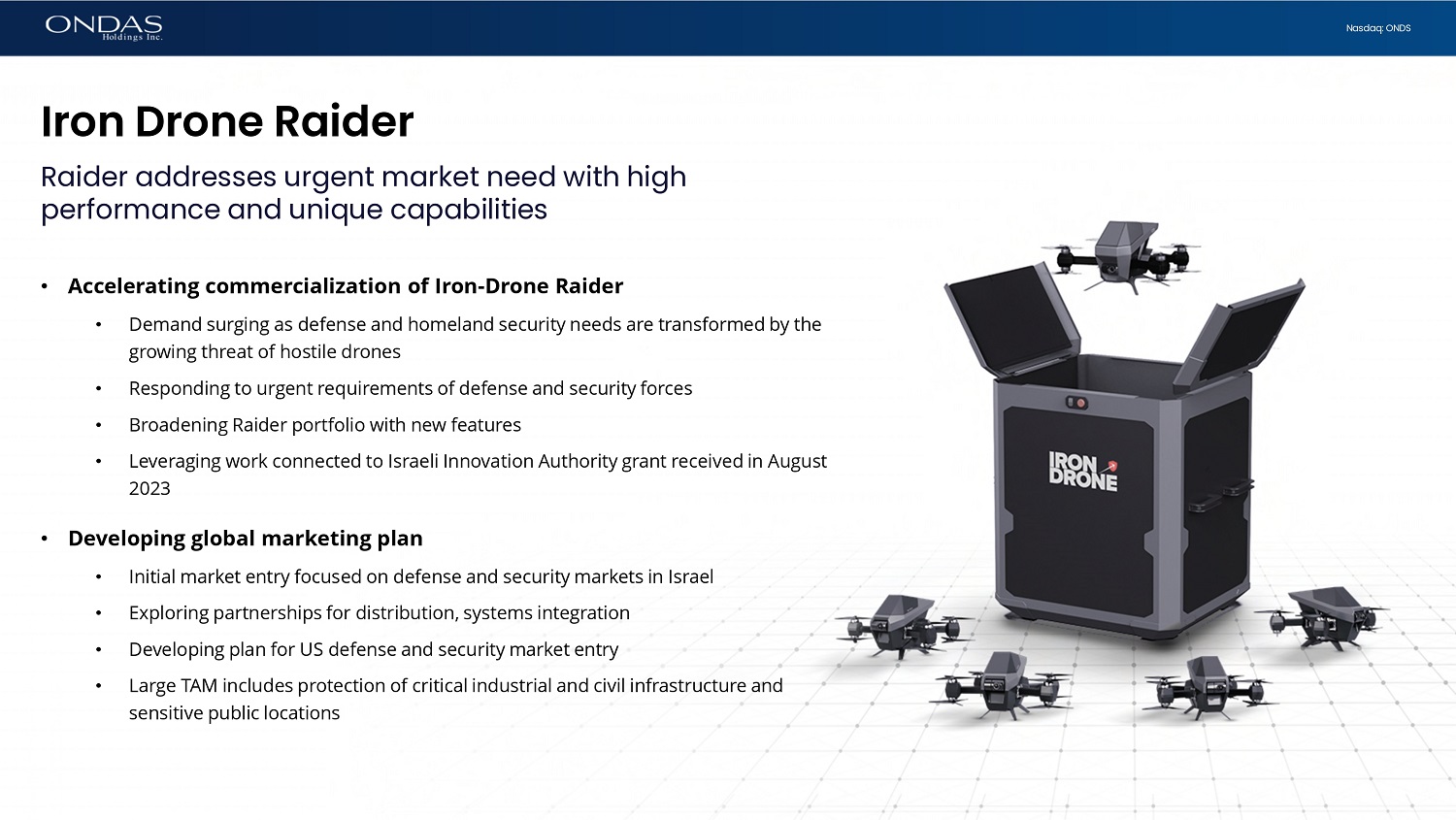 20 Nasdaq: ONDS Iron Drone Raider Raider addresses urgent market need with high performance and unique capabilities • Accelerating commercialization of Iron - Drone Raider • Demand surging as defense and homeland security needs are transformed by the growing threat of hostile drones • Responding to urgent requirements of defense and security forces • Broadening Raider portfolio with new features • Leveraging work connected to Israeli Innovation Authority grant received in August 2023 • Developing global marketing plan • Initial market entry focused on defense and security markets in Israel • Exploring partnerships for distribution, systems integration • Developing plan for US defense and security market entry • Large TAM includes protection of critical industrial and civil infrastructure and sensitive public locations